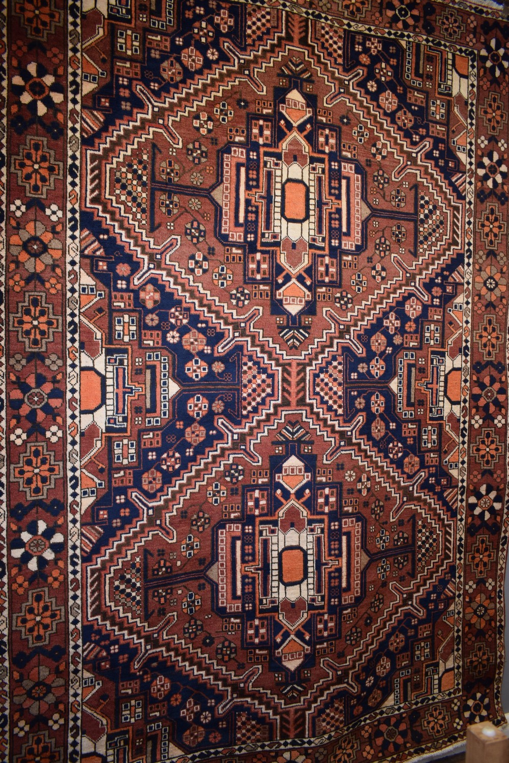A RARE WITH CAUCASIAN INFLUENCE TRIBAL PERSIAN DESIGN BAKHTIAR SHALAMZAR CARPET. 100%SOLID & DENSE WOOL PILE. EX-SHOW ROOM EXHIBITED CARPET. IN SUPERB CONDITION. HAND-KNOTTED TRIBAL WEAVE. TRIBAL MID CENTURY STYLE & COLOR BAKHTIARI DESIGN OF STYLIZED BOLD MEDALLION AND QUARTERED CORNER MEDALLIONS IN A FIELD OF FLORAL PATTERNS. BORDER OF PALMETTES. SIZE: 308X208CM CERTIFICATE OF AUTHENTICITY INCLUDED. ORIGIN: IRAN - RRP: $4,400