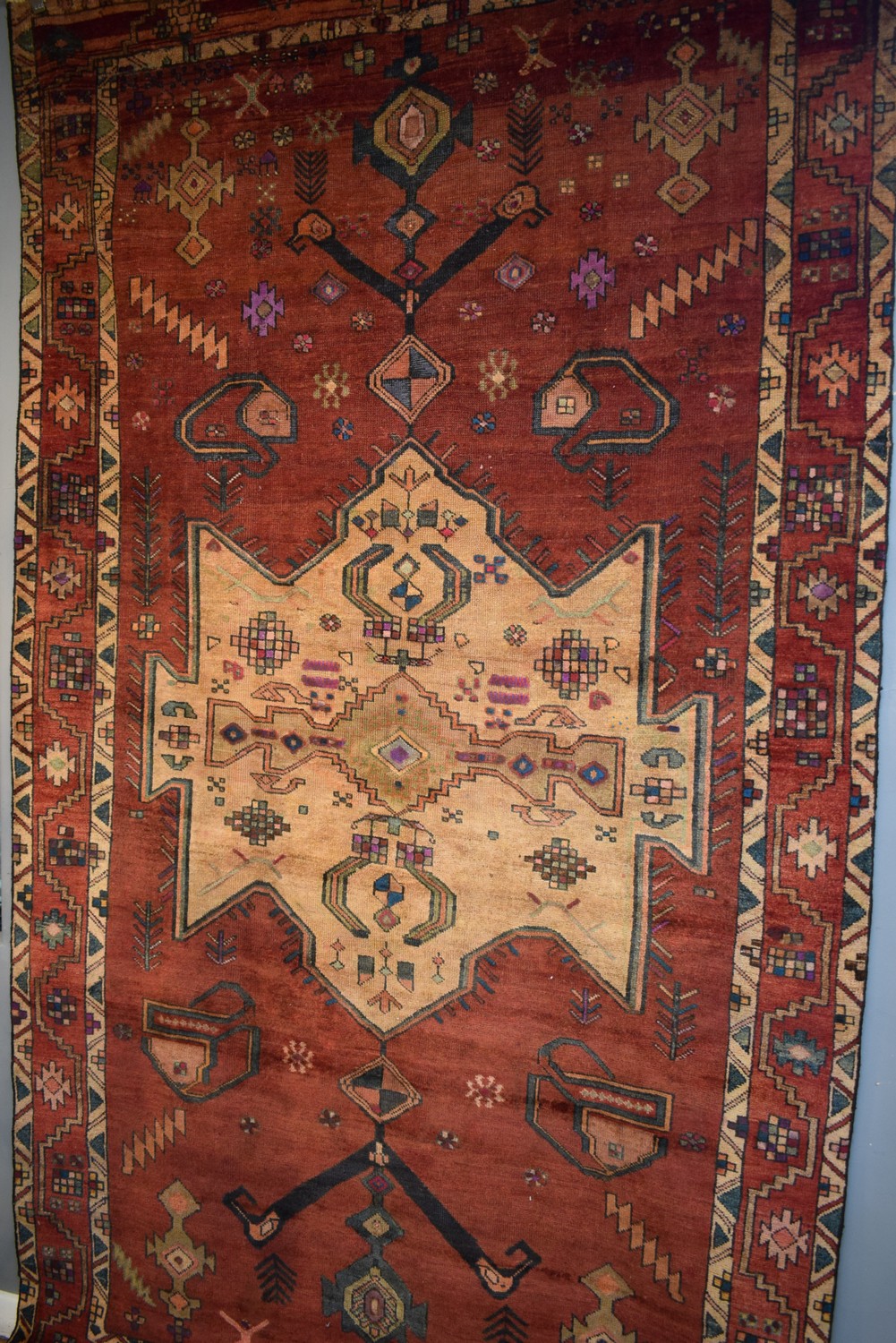 A TRIBAL PERSIAN CIRCA 1960'S KOHI RUG. 100% VINTAGE PILE. NATURAL DYES RESTORED PIECE HAND-KNOTTED TRIBAL WEAVE WITH DESIGN OF BOLD ANCHORED MEDALLION IN TAN TONES AND QUARTERED CORNER MEDALLIONS IN A FIELD OF "TREE OF LIFE" PATTERNS AND GEOMETRIC PATTERNS. CERTIFICATE OF AUTHENTICITY INCLUDED. SIZE: 329X190CM ORIGIN: PERSIA - RRP: $4,200