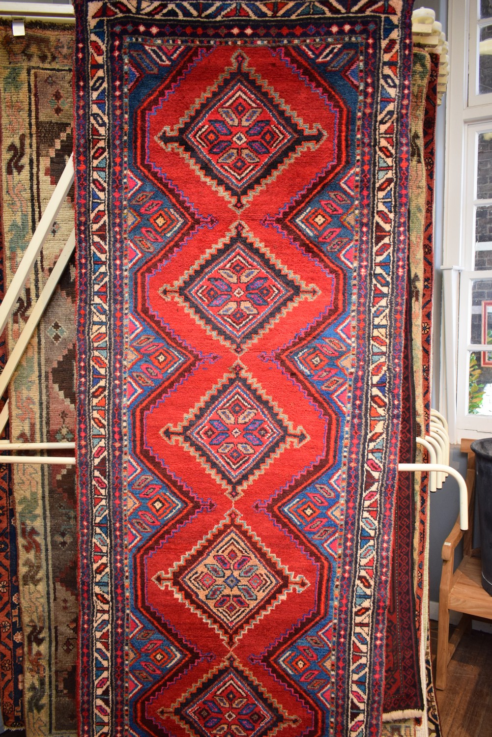A BEAUTIFUL HARD-WEARING HAND-KNOTTED PERSIAN ZAGEH RUNNER. CONTINUING DIAMOND SHAPED MEDALLIONS IN AN OPEN STUNNING POMEGRANATE RED FIELD. 100% WOOL & NATURAL DYES. DENSE PILE. IN EXCELLENT CONDITION. SIZE: 298X84CM ORIGIN: IRAN - RRP: $2,200 CERTIFICATE OF AUTHENTICITY INCLUDED.