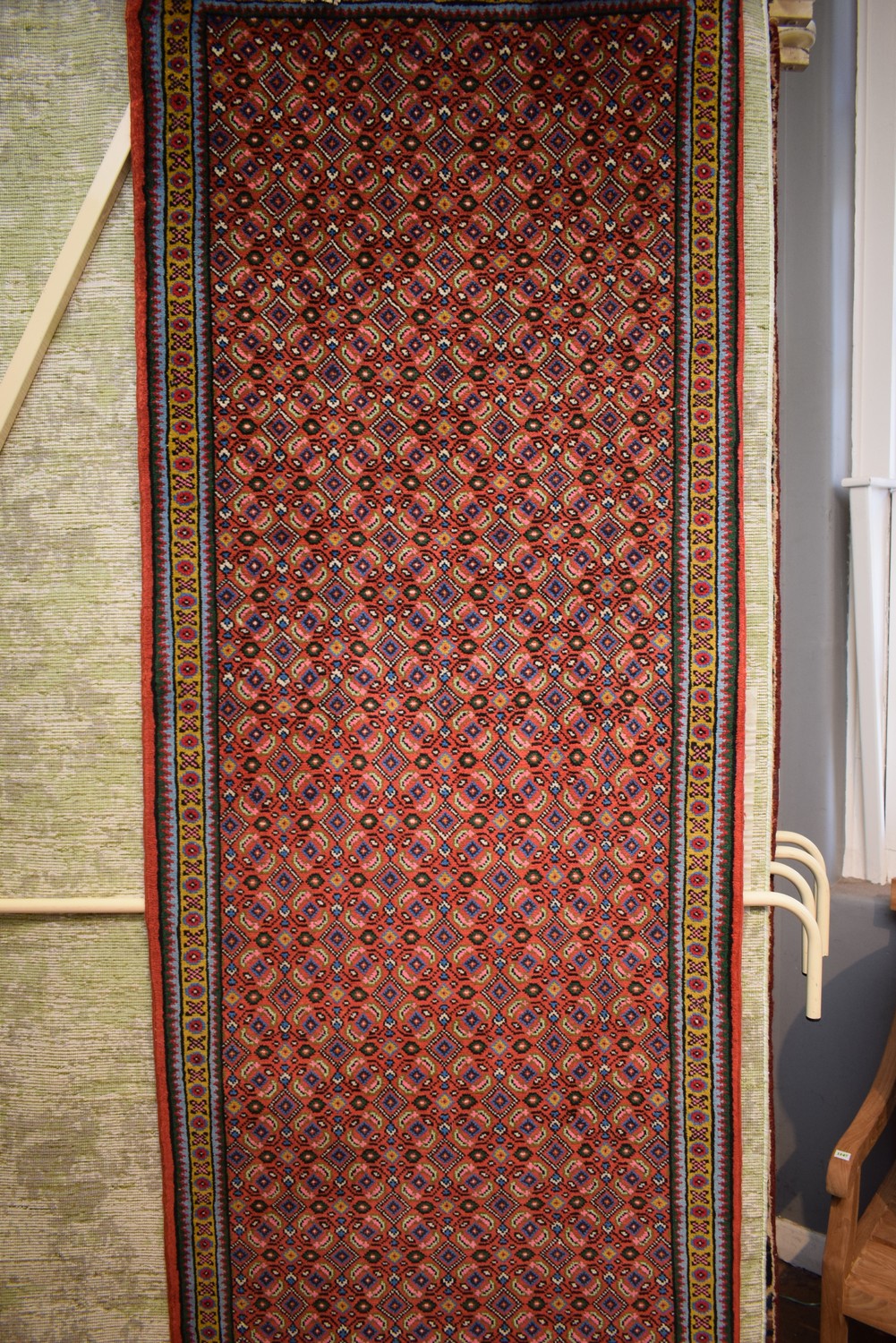 SUPERFINE TRADITIONAL PERSIAN ARDEBIL RUNNER, HAND-KNOTTED. EXCELLENT CONDITION. SOLID AND DENSE 100% WOOL PILE IN A FIELD OF HERATI MAHI MOTIFS. IN TONNES OF RED, PURPLE AND CREAM. SIZE: 296X78CM CERTIFICATE OF AUTHENTICITY INCLUDED. ORIGIN: IRAN - RRP: $2,900