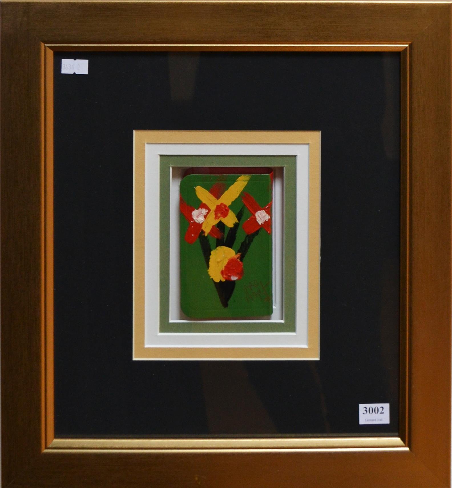 PRO HART, RED AND YELLOW FLORAL ARRANGEMENT, OIL ON BIBLE, 12 X 8CM, LEONARD JOEL DELIVERY SIZE: SMALL