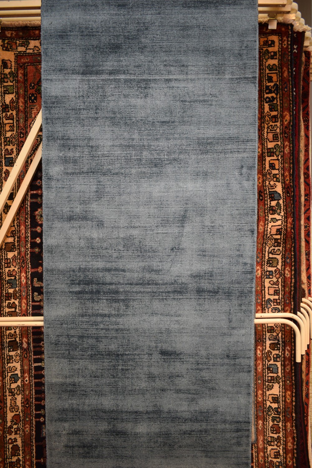 A BRAND-NEW MODERN VISCOSE AND SILK TEXTURE RUG IN A BEAUTIFUL SEA GREEN & BLUE. SIZE: 404X83CM ORIGIN: INDIA