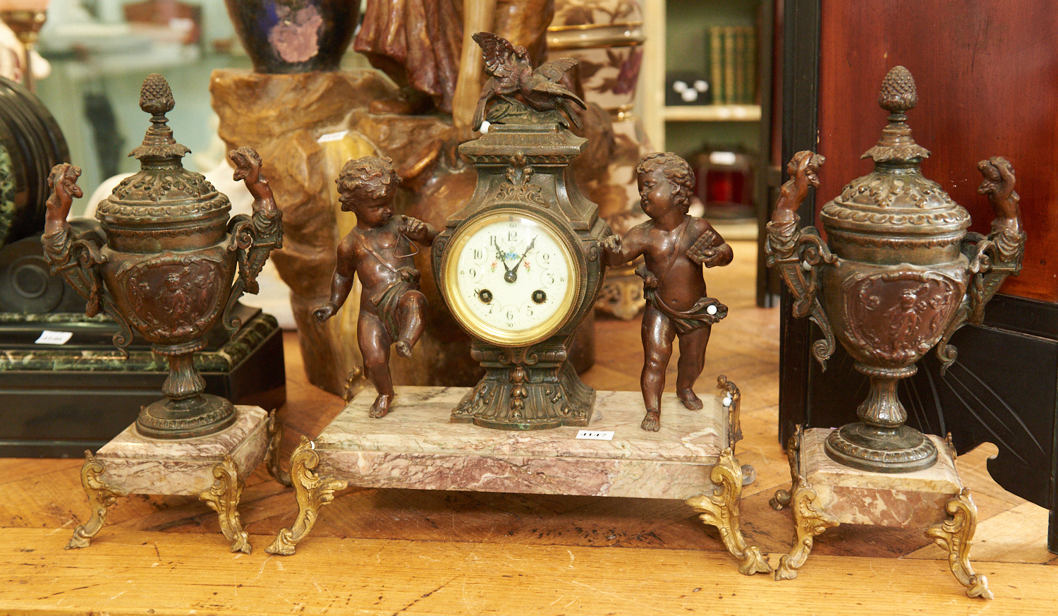 A THREE PIECE CLOCK GARNITURE WITH CHERUB DECORATION (38 CM H), LEONARD JOEL LOCAL DELIVERY SIZE: SMALL