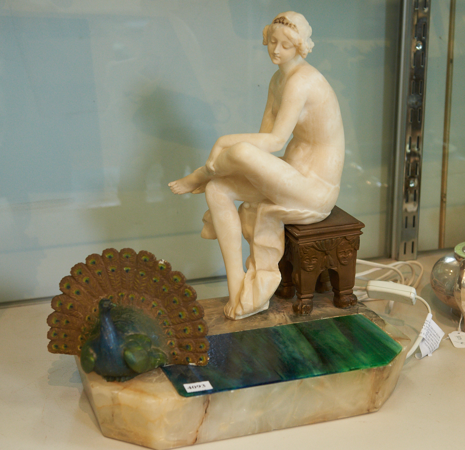 AN ART DECO LAMP SEATED LADY WITH PEACOCK (42 CM H), LEONARD JOEL LOCAL DELIVERY SIZE: SMALL
