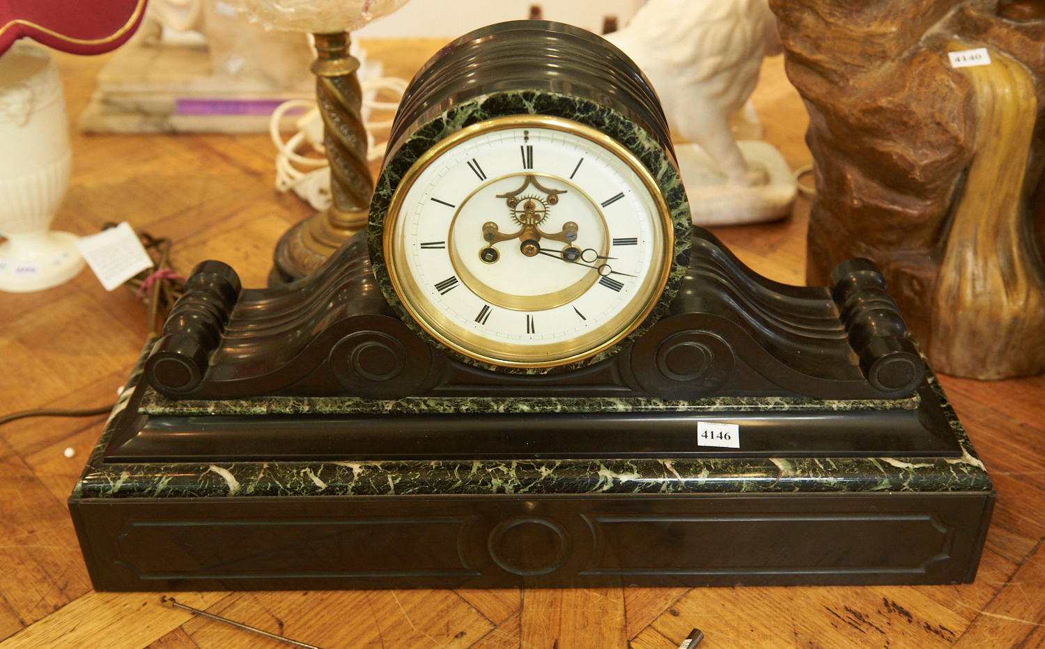 A SLATE MANTLE CLOCK WITH KEY W.56CM, LEONARD JOEL LOCAL DELIVERY SIZE: SMALL