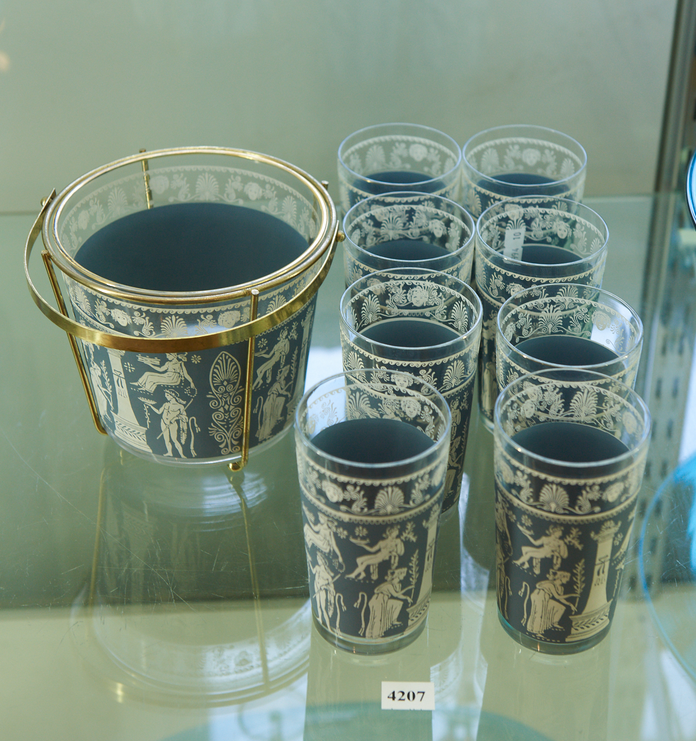 A DRINK SET COMPRISING TUMBERS AND ICE BUCKET WITH GRECO ROMAN MOTIF, LEONARD JOEL LOCAL DELIVERY SIZE: SMALL