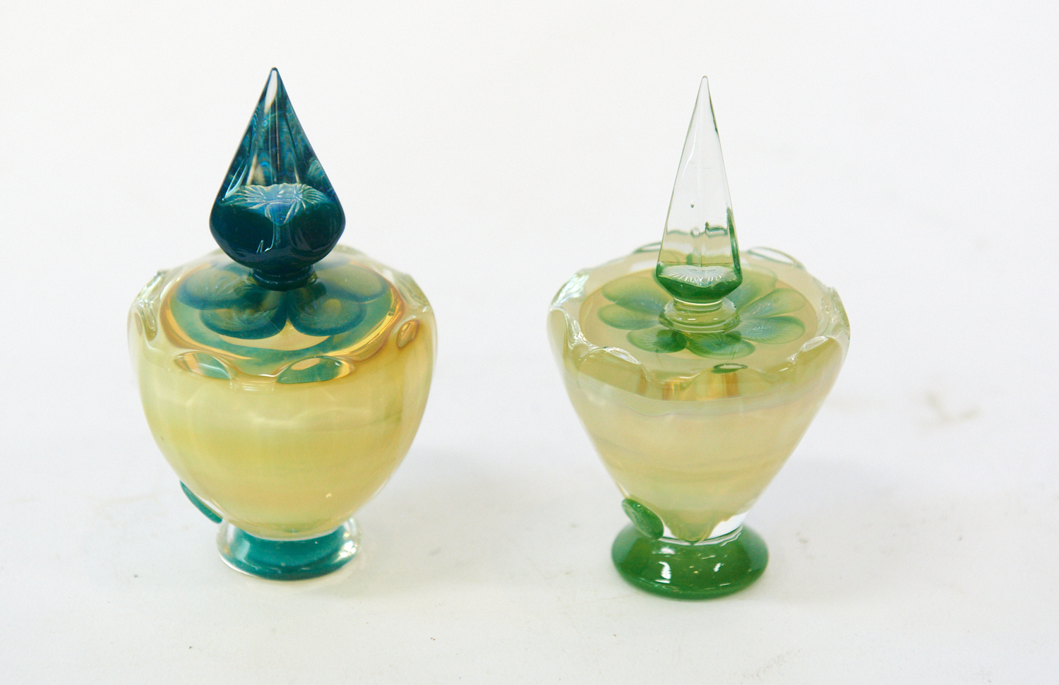 TWO RICHARD CLEMENTS ART GLASS PERFUME BOTTLES IN SHADES OF GREEN H.10.2CM, LEONARD JOEL LOCAL DELIVERY SIZE: SMALL