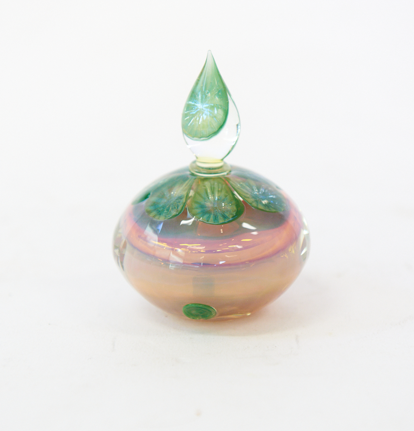 A RICHARD CLEMENTS ART GLASS PERFUME BOTTLE OF SQUAT FORM WITH PETAL FORM COLLAR H.8.1CM, LEONARD JOEL LOCAL DELIVERY SIZE: SMALL