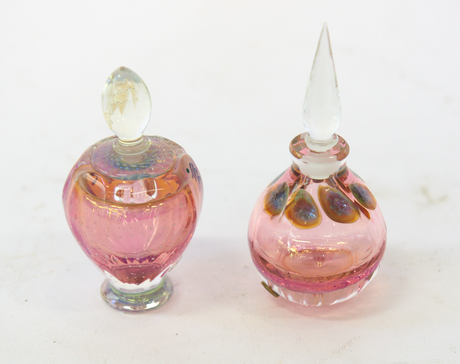 TWO RICHARD CLEMENTS ART GLASS PERFUME BOTTLES IN SHADES OF PINK H.11.4CM AND H.9.7CM, LEONARD JOEL LOCAL DELIVERY SIZE: SMALL