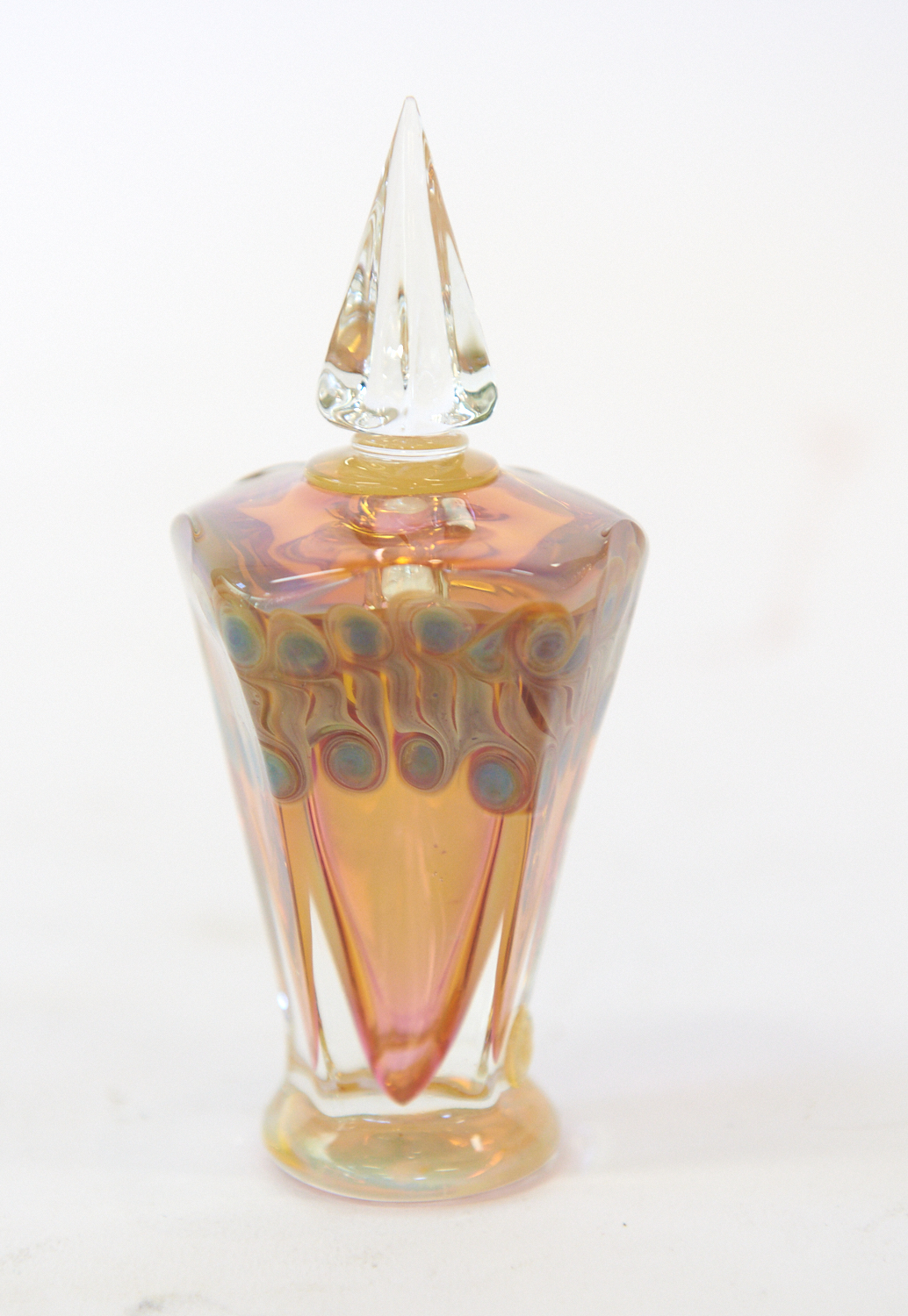 A RICHARD CLEMENTS ART GLASS PERFUME BOTTLE TALL FORM WITH CLEAR STOPPER H.12CM, LEONARD JOEL LOCAL DELIVERY SIZE: SMALL