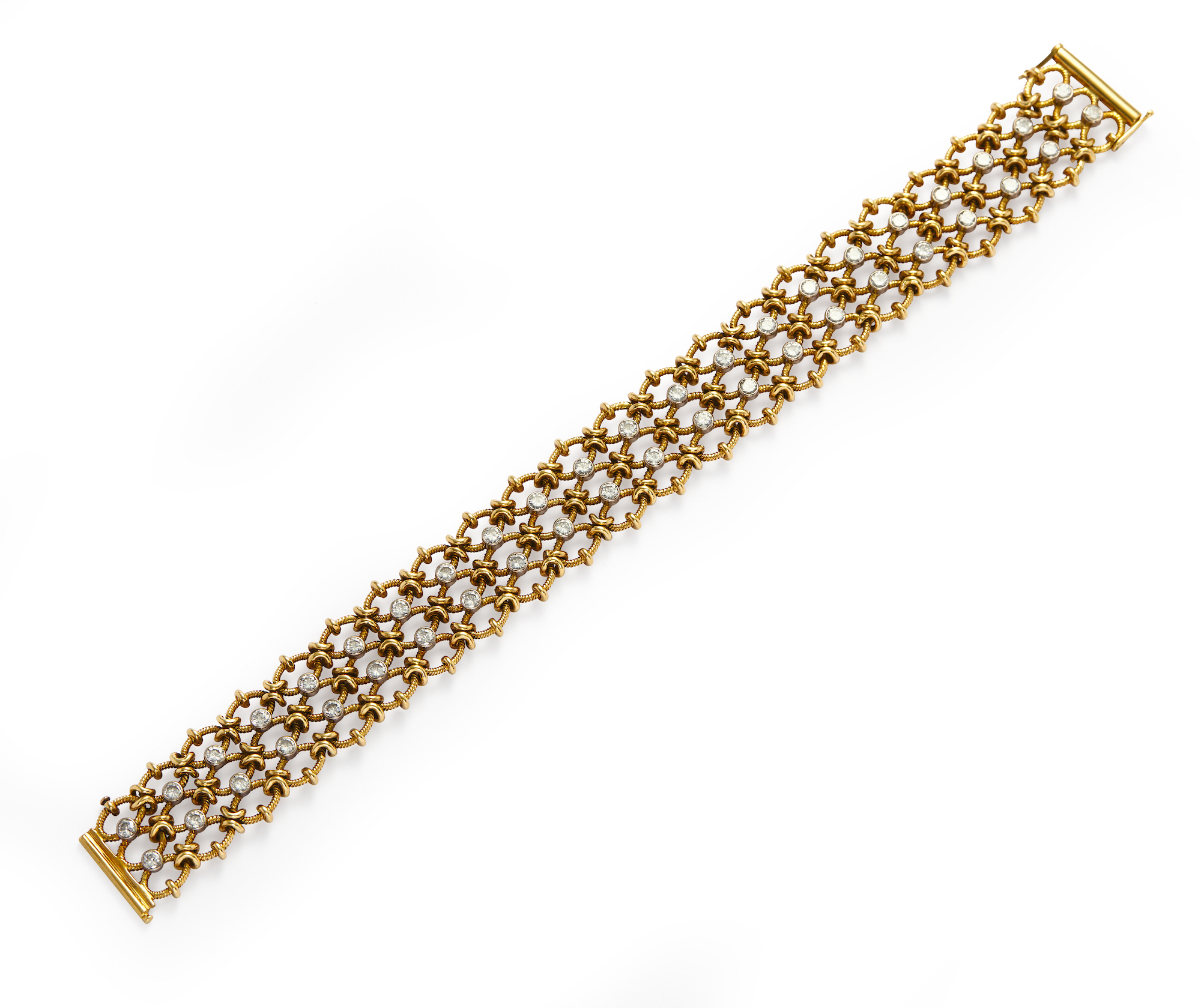 Designed as a wide strap of arabesque design, decorated at intervals with 44 collet-set diamonds, the diamonds together weighing approximately 1.76 carats, length approximately 177mm, gross weight 35.1 grams.