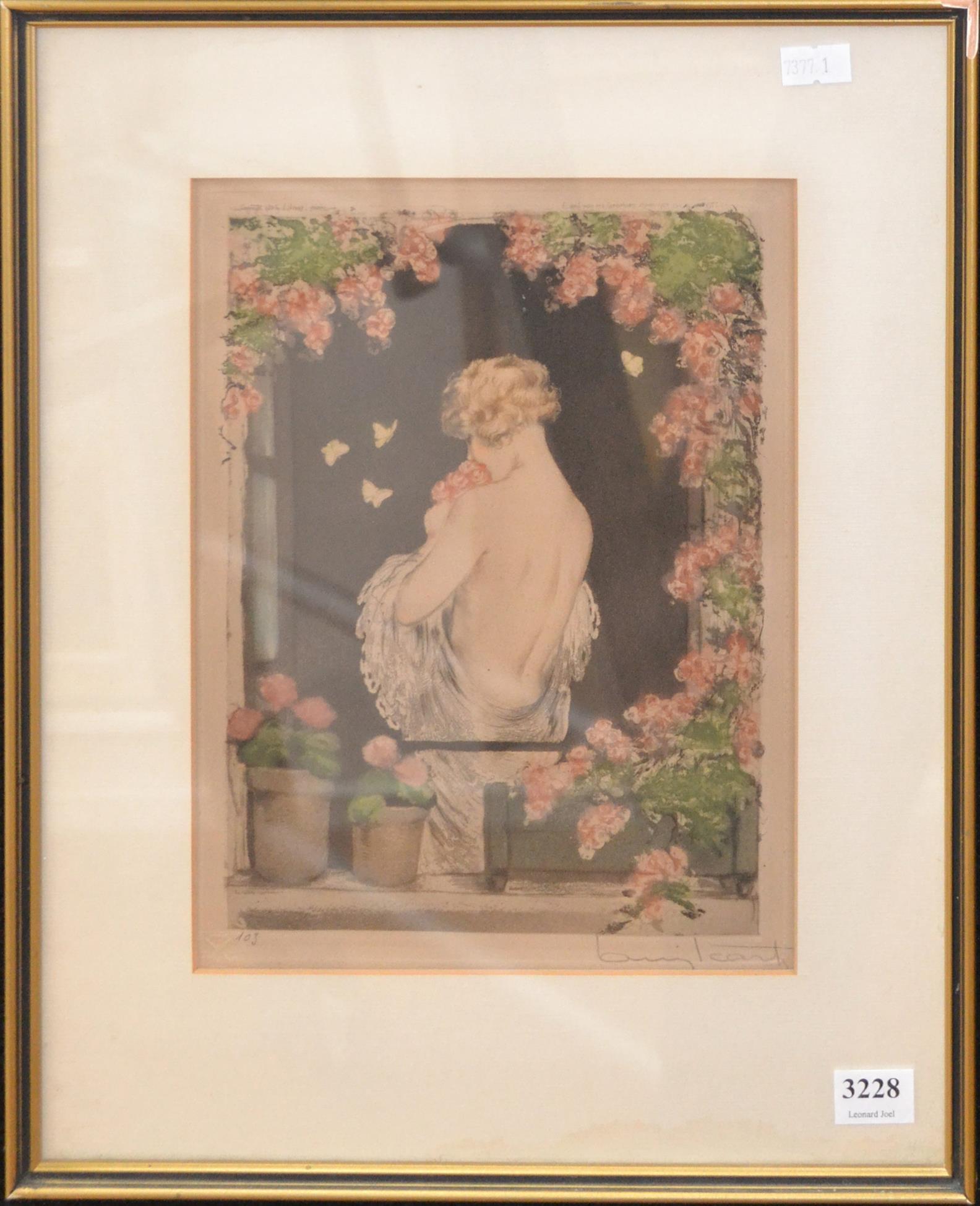LOUIS ICART, NUDE IN WINDOW 1928, COLOURED ENGRAVING, 22.5 X 16.5CM, LEONARD JOEL DELIVERY SIZE: MEDIUM