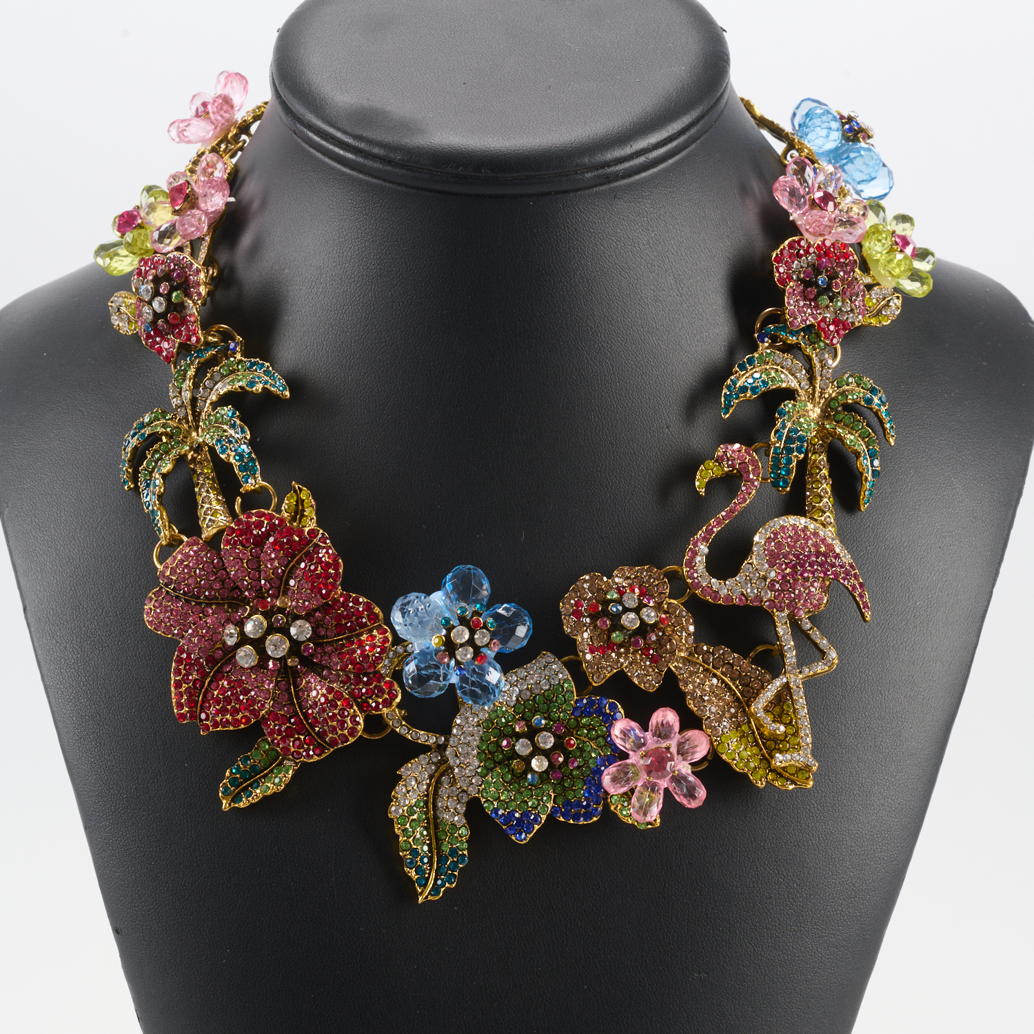 A SWAROVSKI CRYSTAL ENCRUSTED NECKLACE BY OSCAR DE LA RENTA, FEATURING TROPICAL FLOWERS, FLAMINGO'S AND PALM TREES, TO A GOLD TONED CHAIN WITH LOBSTER CLASP, SIGNED