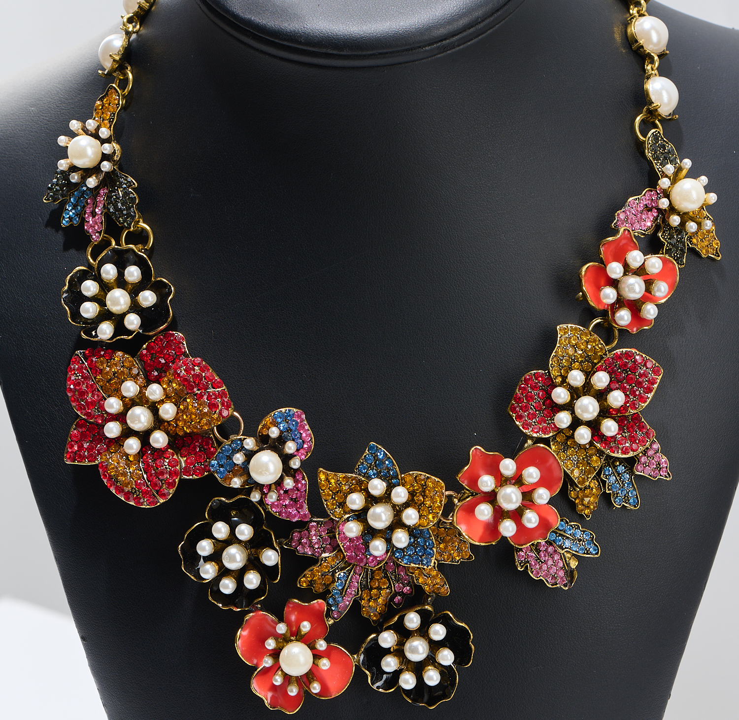 A PASTE AND FAUX PEARL COSTUME NECKLACE BY OSCAR DE LA RENTA, FEATURING FLORAL DESIGN WITH ORANGE AND BLACK ENAMEL DETAIL, TO A GOLD TONED CHAIN WITH LOBSTER CLASP, SIGNED