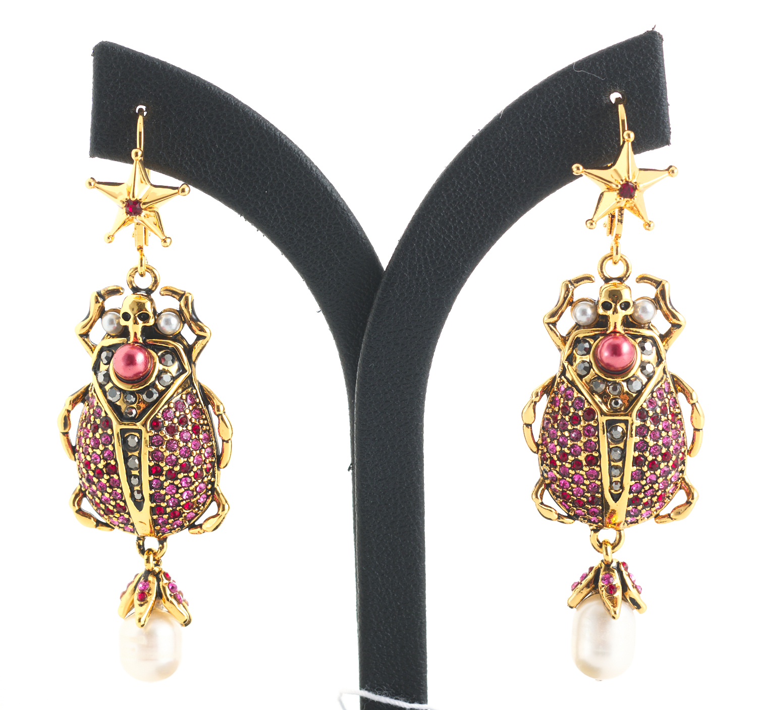 A PAIR OF BEETLE EARRINGS BY ALEXANDER MCQUEEN, FEATURING FRESHWATER PEARLS AND SWAROVSKI CRYSTALS, IN GOLD TONED METAL, TO LEVER BACK FITTINGS, MADE IN ITALY, SIGNED