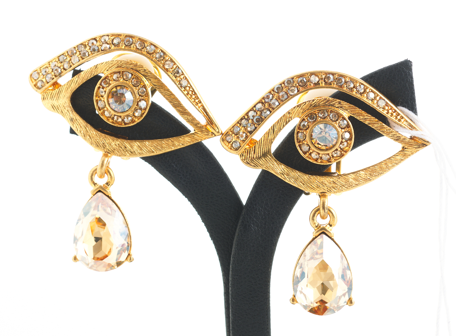 A PAIR OF PAVE CRYSTAL DROP EARRINGS BY OSCAR DE LA RENTA, FEATURING EVIL EYE DESIGN, EACH WITH A PEAR CUT PAVE CRYSTAL DROP, TO CLIP ON FITTINGS, IN GOLD TONED METAL, SIGNED