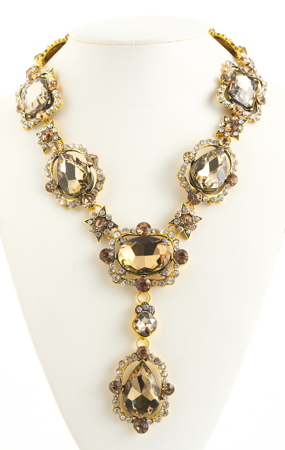 A GEM-SET NECKLACE BY OSCAR DE LA RENTA, FEATURING OLIVE, CHAMPAGNE AND CLEAR PASTE CLUSTERS, TO A GOLD TONED CHAIN WITH LOBSTER CLASP, SIGNED