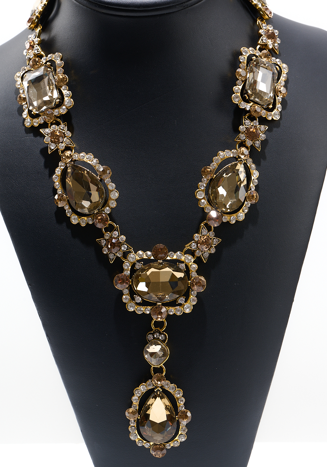 AN ANTIQUE REVIVAL GEM SET NECKLACE BY OSCAR DE LA RENTA, FEATURING OLIVE, CHAMPAGNE AND CLEAR PASTE CLUSTERS, TO A GOLD TONED CHAIN WITH LOBSTER CLASP, SIGNED