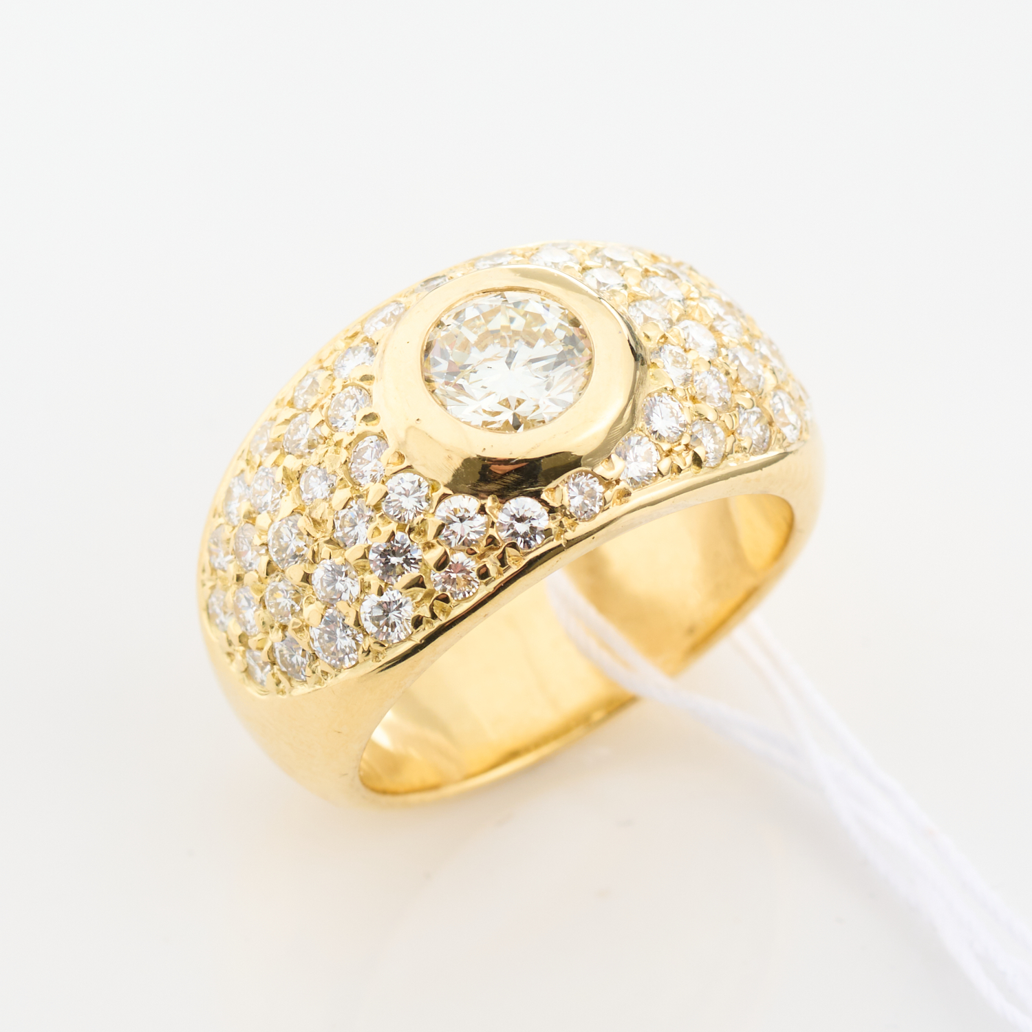 A DIAMOND BOMBÉ RING, CENTRALLY SET WITH A ROUND BRILLIANT CUT DIAMOND OF 0.78CT WITH PAVÉ SET DIAMOND SURROUND, IN 18CT GOLD, RING SIZE L - M, 13GMS
