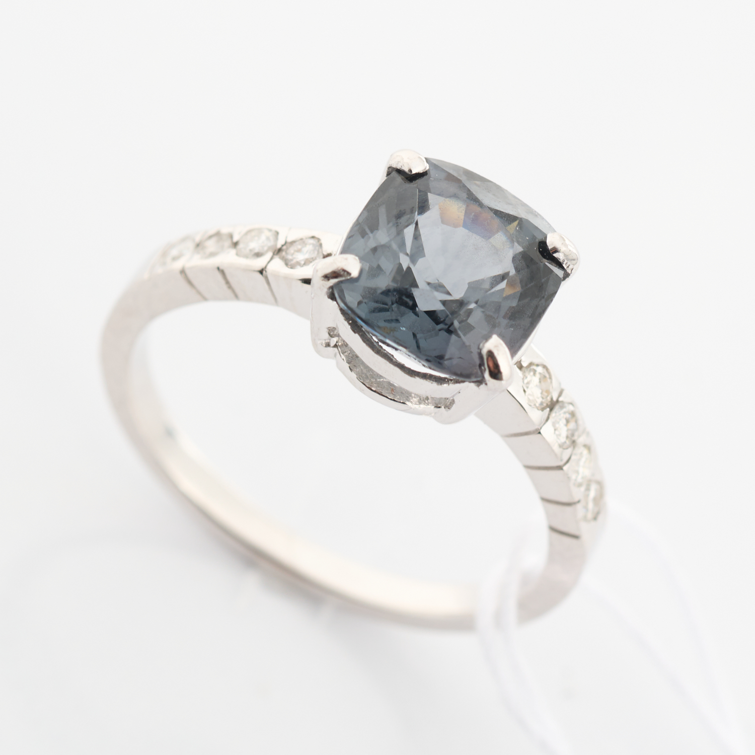 A SPINEL AND DIAMOND RING IN 18CT WHITE GOLD, FEATURING A CUSHION CUT SPINEL OF 2.30CTS, SHOULDERED BY ROUND BRILLIANT CUT DIAMONDS, SIZE L-M, 3.3GMS