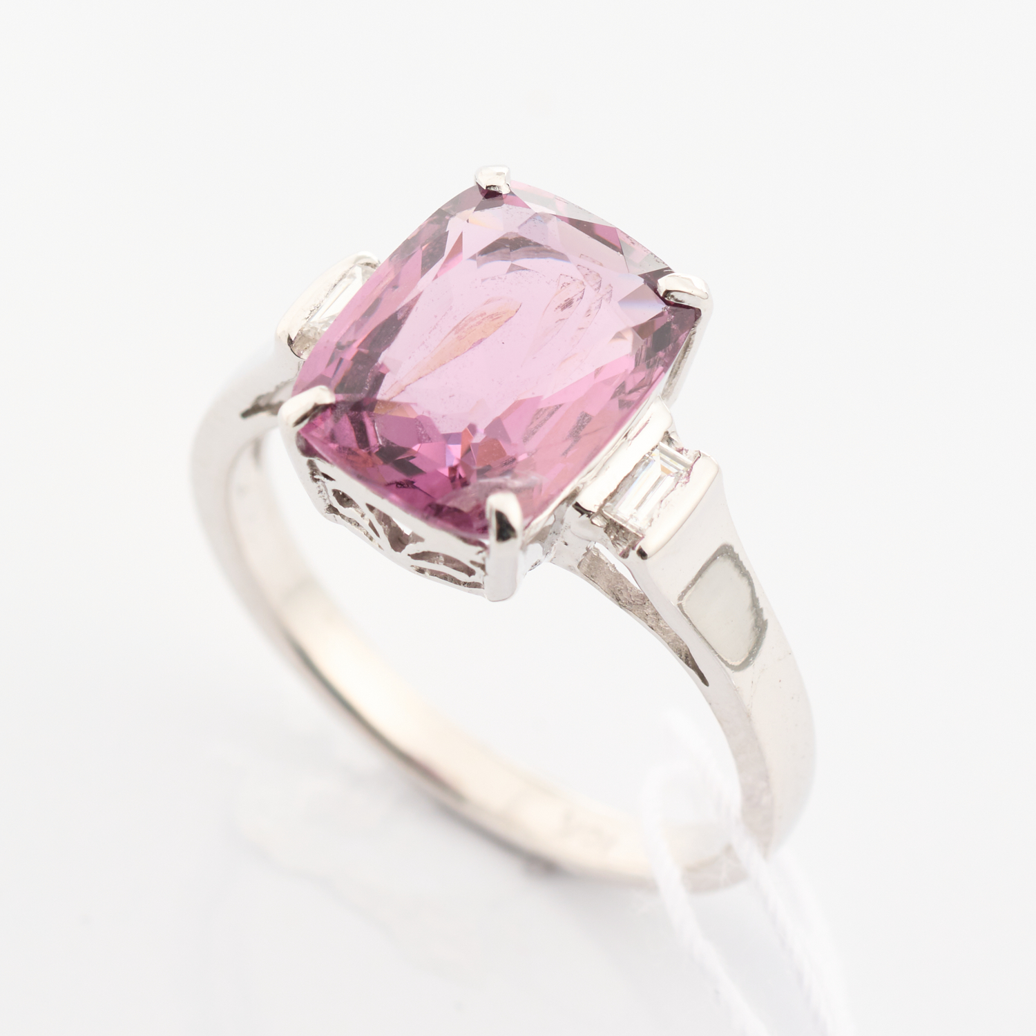 A SPINEL AND DIAMOND DRESS RING FEATURING A CUSHION CUT SPINEL OF APPROXIMATELY 3.40CTS FLANKED BY TWO BAGUETTE CUT DIAMONDS, IN 18CT WHITE GOLD, RING SIZE M, APPROXIMATE WEIGHT 3.8GMS