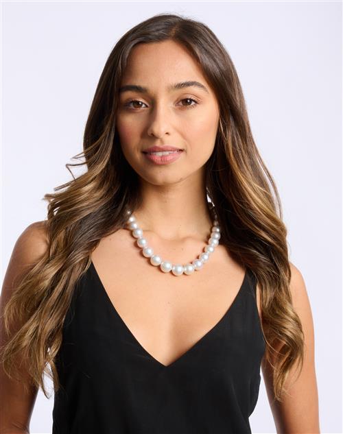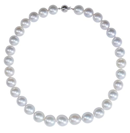 Comprising thirty-one graduating pearls of silver white hues measuring 13.2mm to 16.2mm, to an 18ct white gold ball clasp, length approximately 460mm.