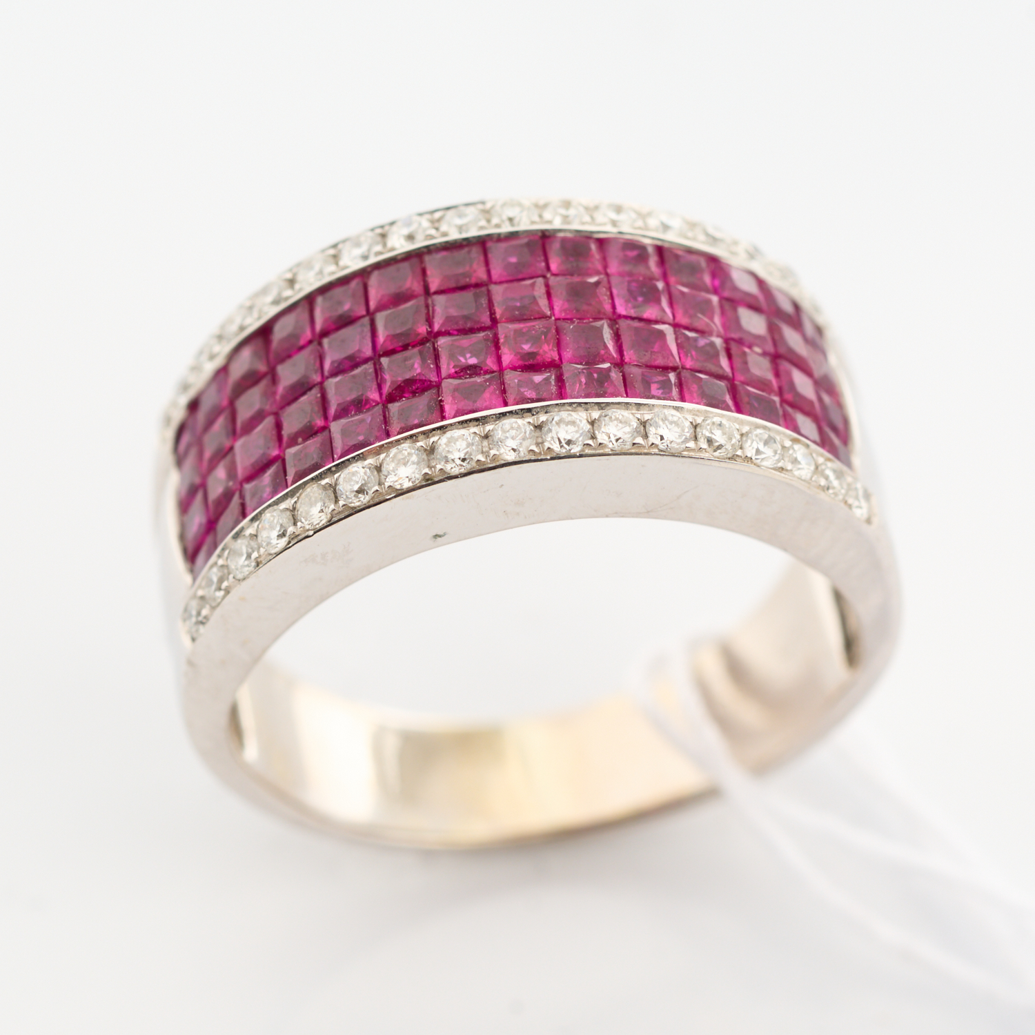 A RUBY AND DIAMOND DRESS RING IN 18CT WHITE GOLD, RING SIZE M, 7.0GMS