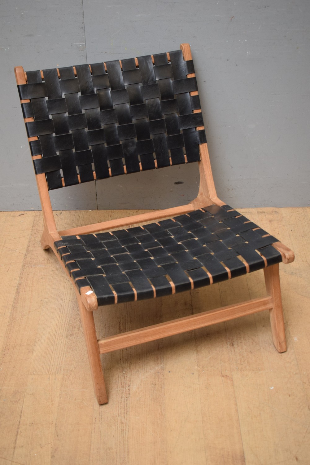 A BLACK LEATHER AND TEAK ACCENT CHAIR (75H X 64W X 88D CM) (LEONARD JOEL DELIVERY SIZE: MEDIUM)