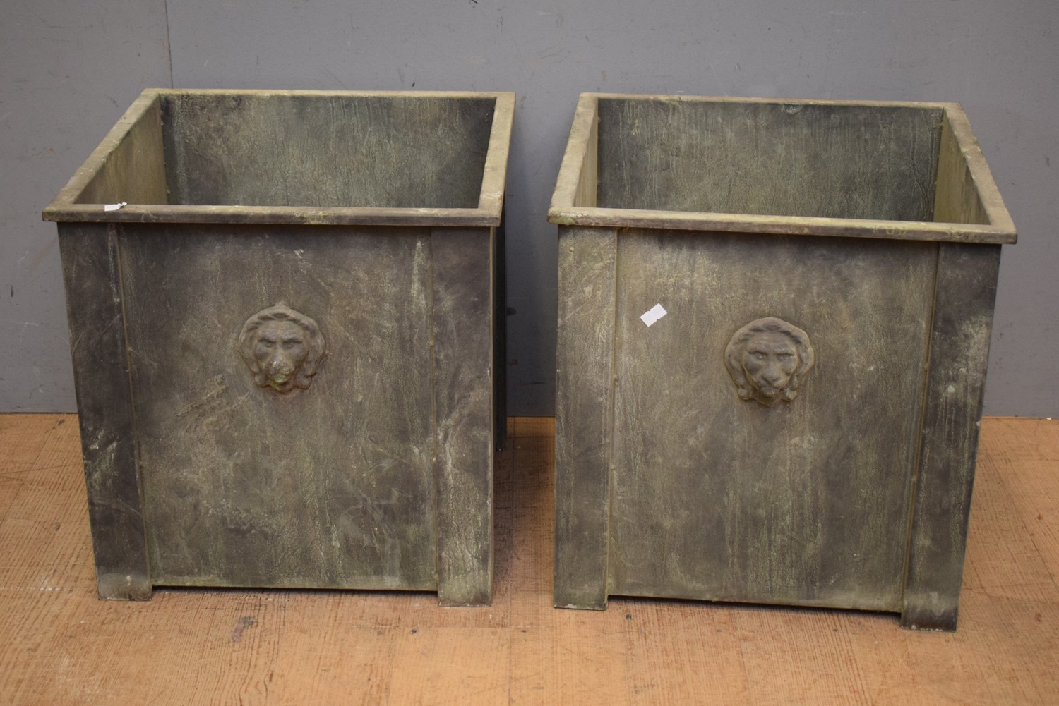 A PAIR OF LIONS HEAD METAL PLANTERS (41H X 40W X 40D CM) (LEONARD JOEL DELIVERY SIZE: MEDIUM)