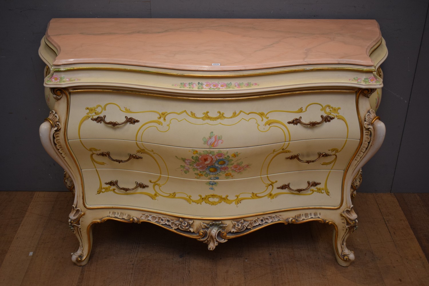 A LOUIS XV STYLE THREE DRAWER BOMBE COMMODE WITH PINK MARBLE TOP (A/F) (87H x 140W x 57D CM) (PLEASE NOTE THIS HEAVY ITEM MUST BE REMOVED BY CARRIERS AT THE CUSTOMER'S EXPENSE. LEONARD JOEL STAFF CANNOT ASSIST CARRYING THIS ITEM) (X-LARGE ITEM)