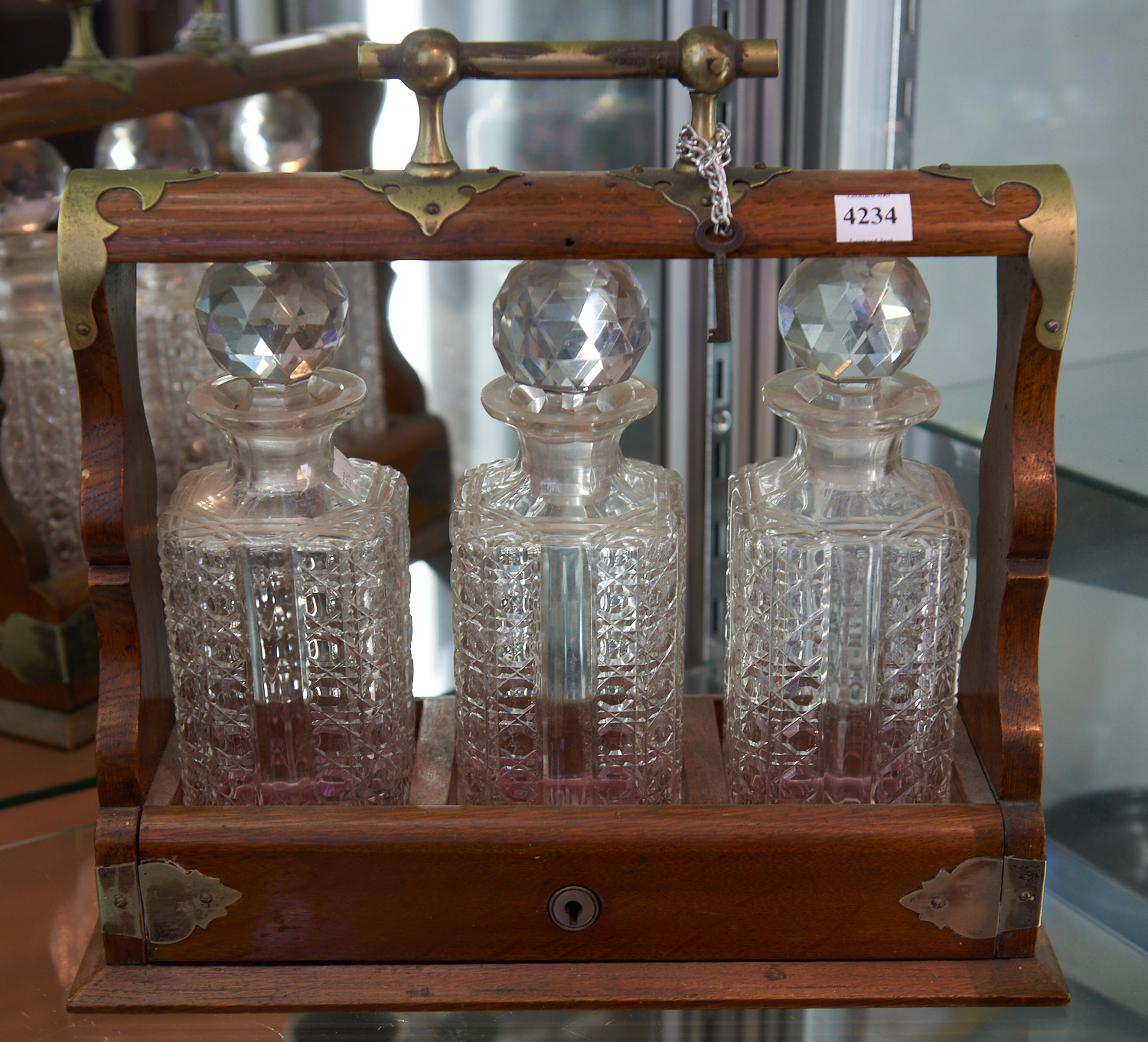 A THREE BOTTLE CUT CRYSTAL TANTALUS SET WITH KEY (A/F) H.35CM, LEONARD JOEL LOCAL DELIVERY SIZE: SMALL