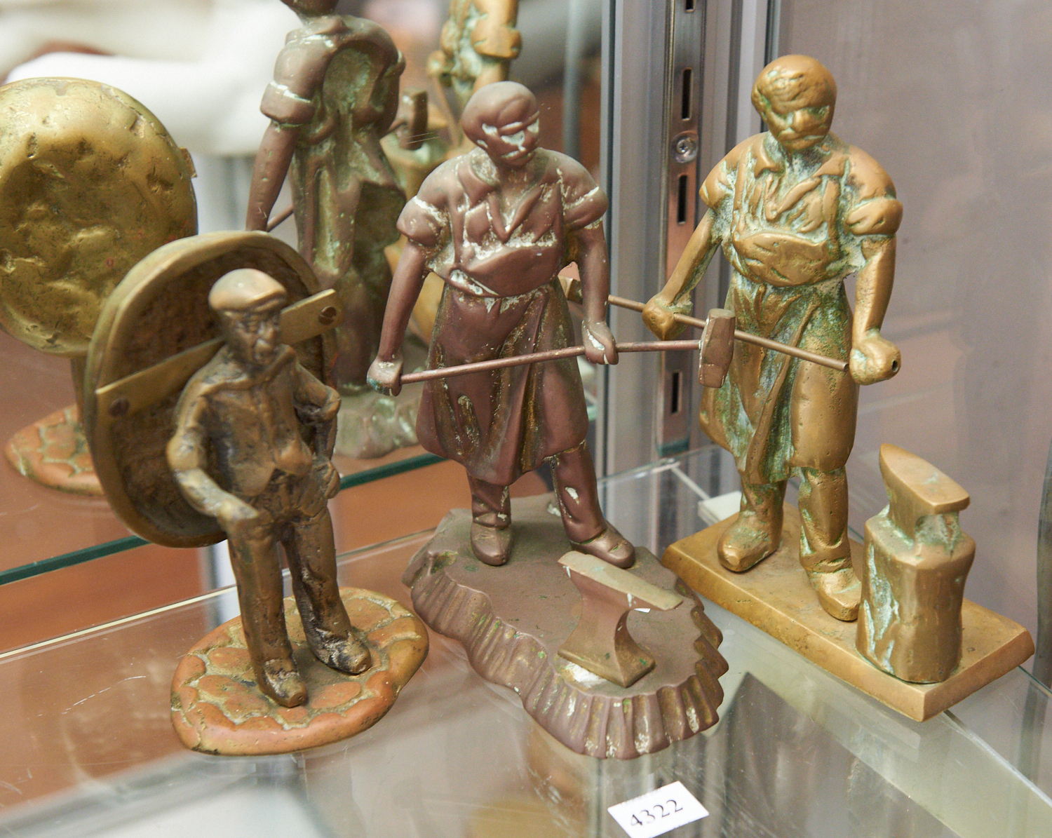 A GROUP OF BRASS FIGURINES OF BLACKSMITH WITH ONE OTHER (20 CM H), LEONARD JOEL LOCAL DELIVERY SIZE: SMALL
