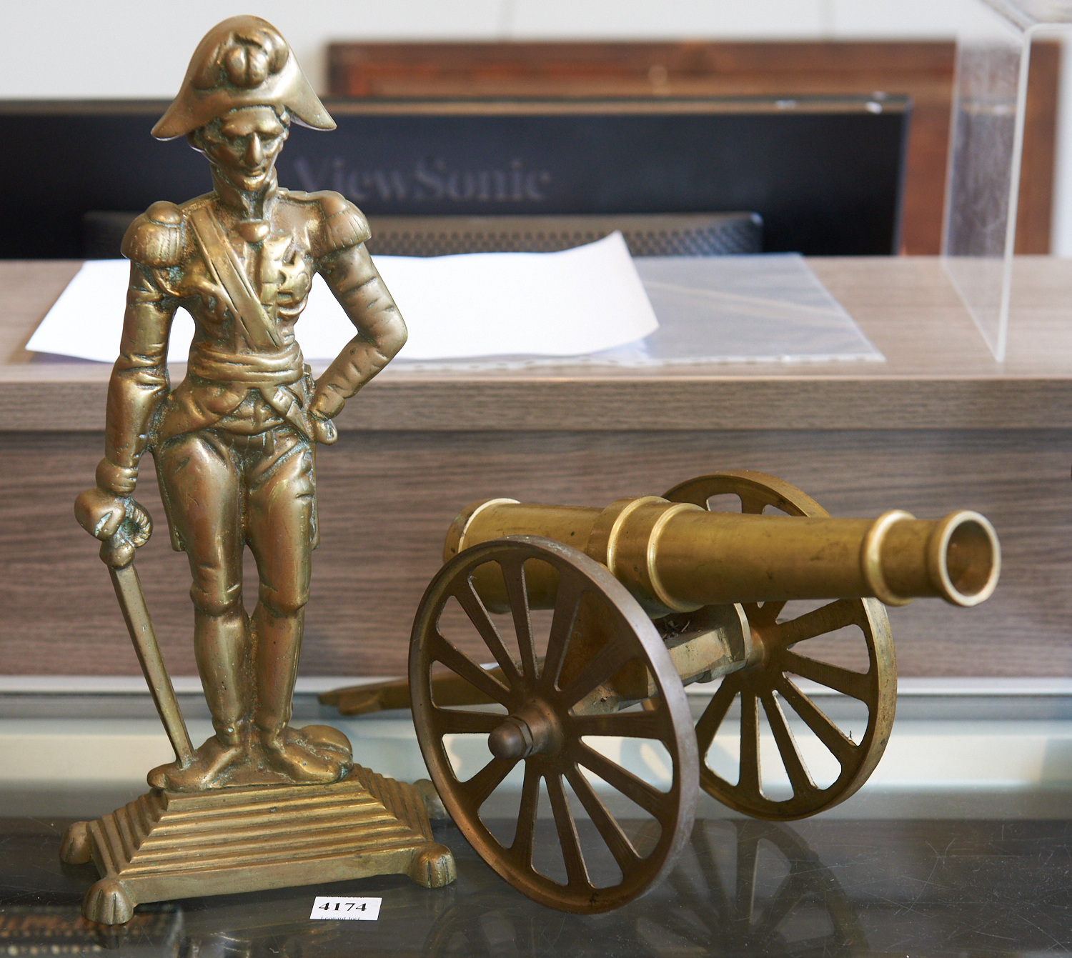 A BRASS SCULPTURE OF A FRENCH SOLDIER TOGETHER WITH A CANNON (32 CM H), LEONARD JOEL LOCAL DELIVERY SIZE: SMALL