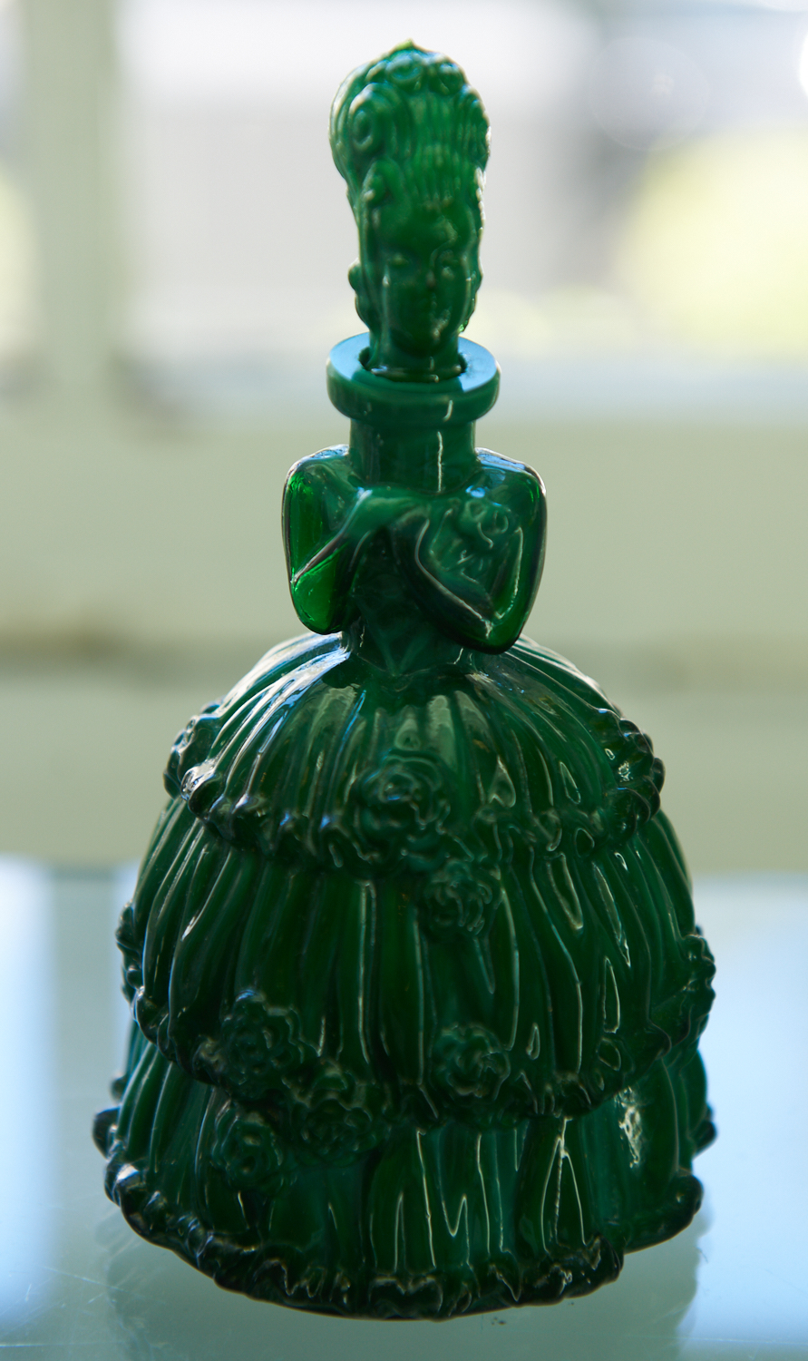 A MALACHITE GLASS PERFUME BOTTLE IN THE FORM OF MARIE ANTOINETTE H.16CM, LEONARD JOEL LOCAL DELIVERY SIZE: SMALL