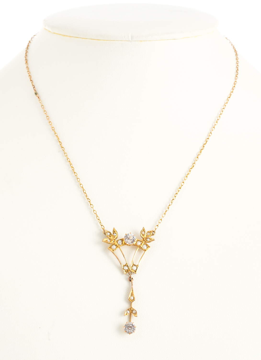 AN EDWARDIAN PASTE AND SEED PEARL NECKLACE IN 9CT GOLD, TO AN INTEGRAL CHAIN AND CLASP IN BASE METAL
