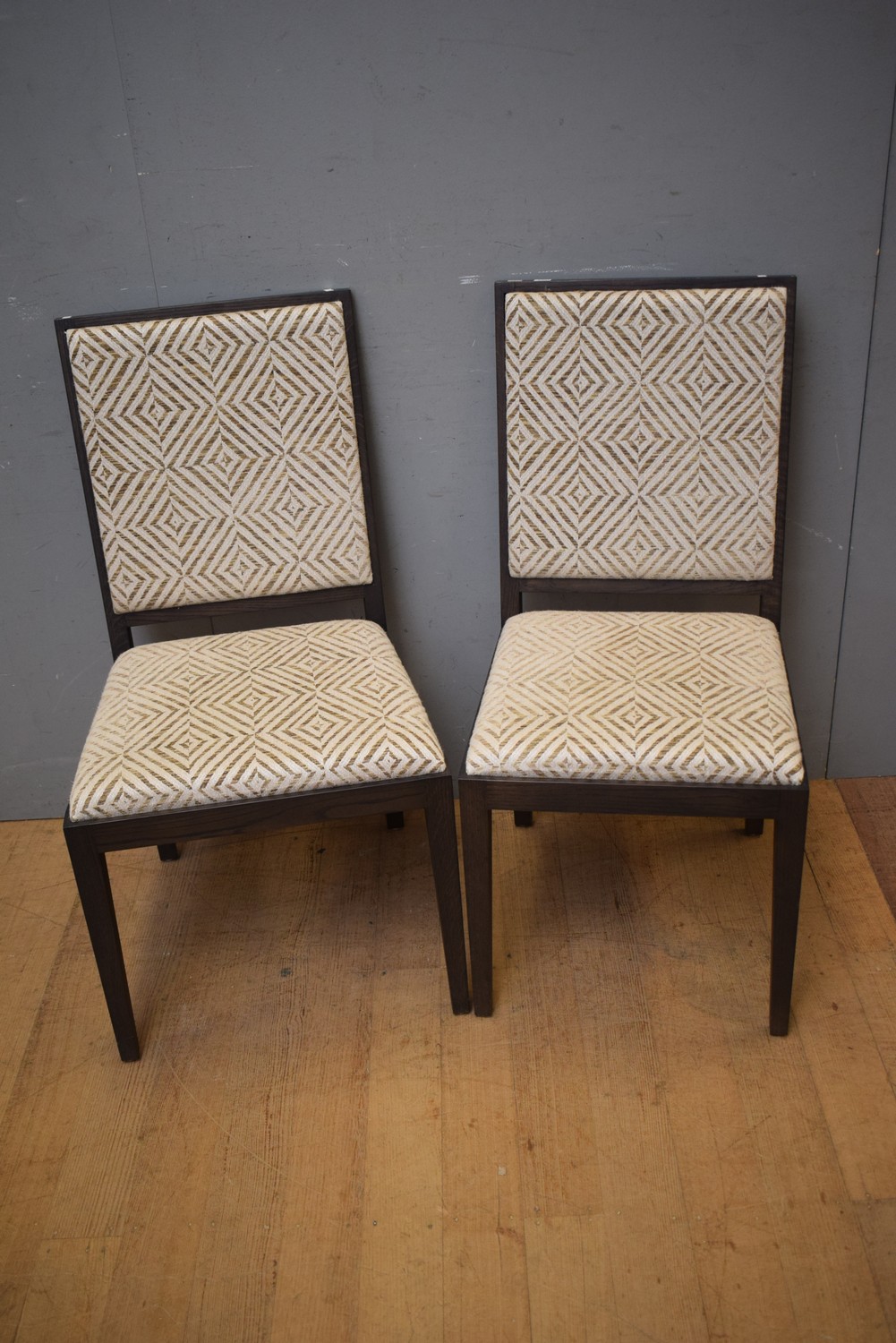 A PAIR OF MORTICE AND TENON HALL CHAIRS IN STAINED WALNUT AND PATTERNED FABRIC (99H X 53W X 49D CM) (LEONARD JOEL DELIVERY SIZE: LARGE)