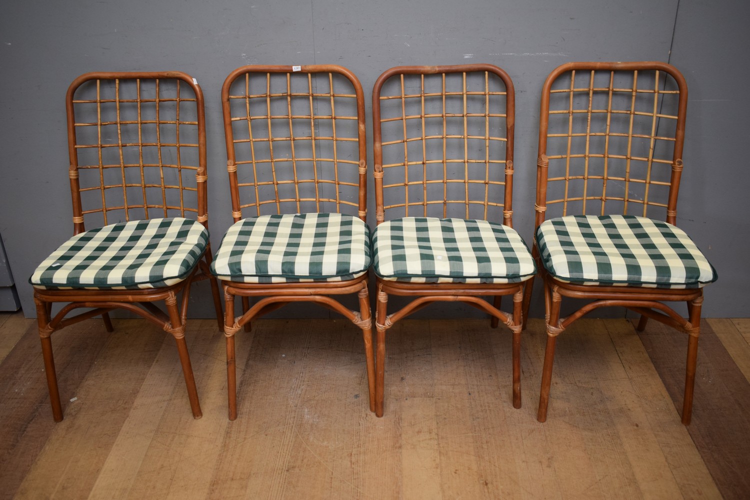 A SET OF FOUR CANE DINING CHAIRS WITH CUSHIONS (96H X 46W X 60D CM) (LEONARD JOEL DELIVERY SIZE: LARGE)