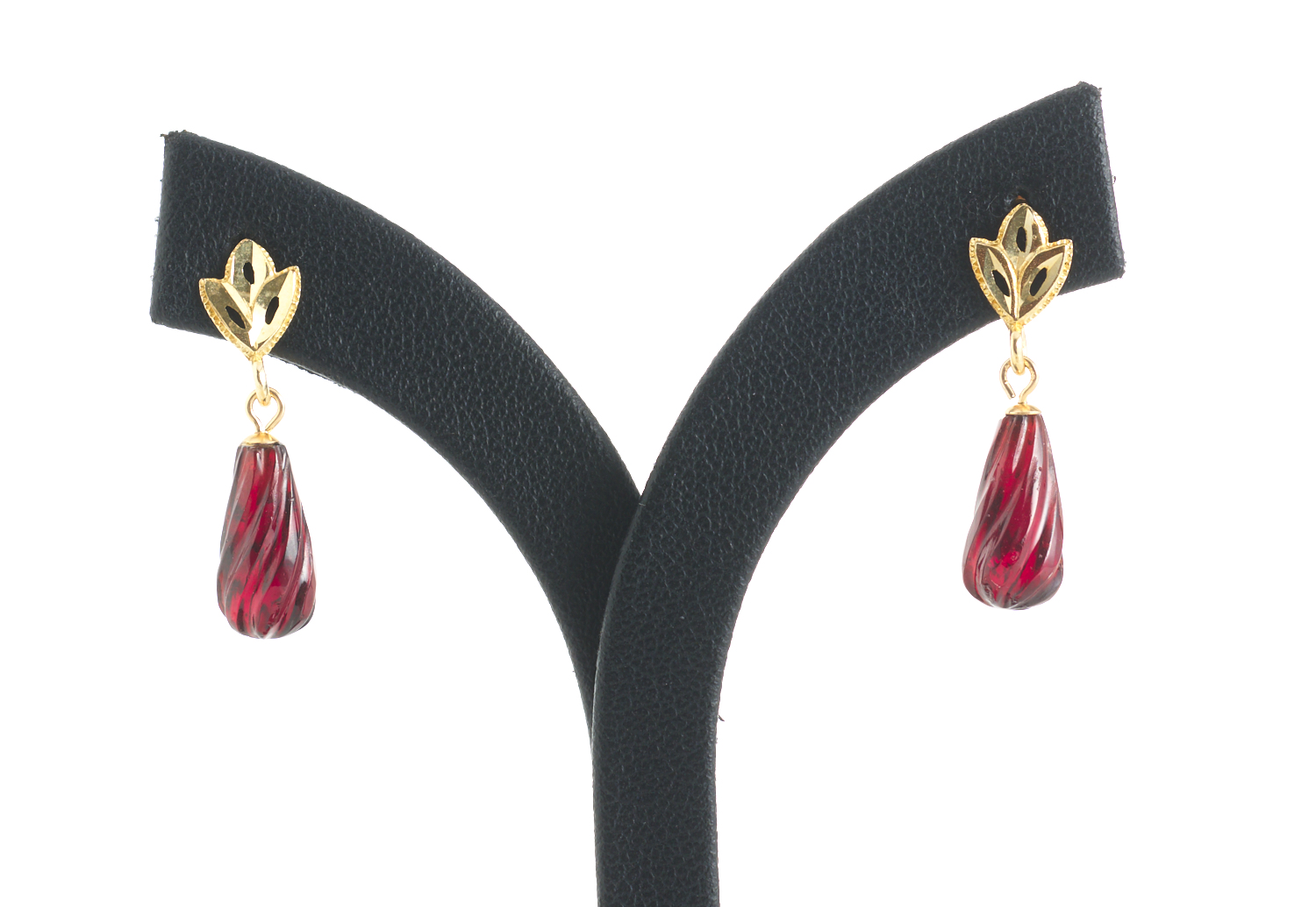A PAIR OF CARVED GARNET EARRINGS IN 14CT GOLD, LENGTH 20MM