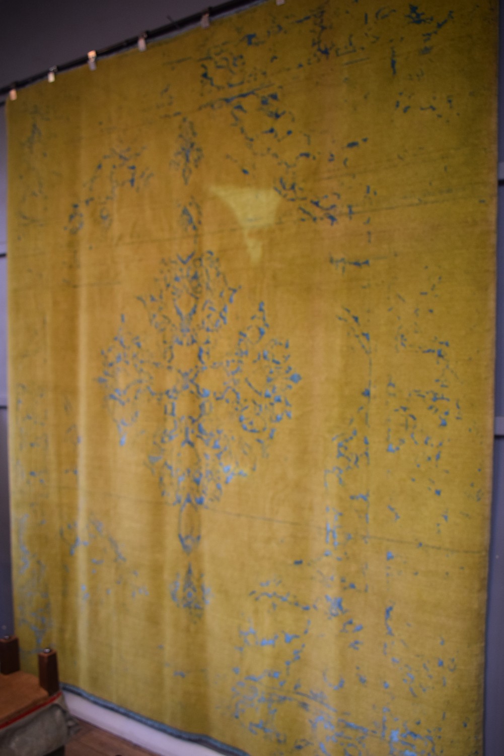 A LUSTROUS CONTEMPORARY NEW PERSIAN MODERN TRANSITIONAL RUG WITH MODERN TRANSITIONAL DESIGN OF ERASED AND EMBOSSED PATTERNS. FINELY HAND-WOVEN PLUSH WOOLLEN AND SILKY TEXTURE PILE GALLERY DISPLAYED CARPET. THE ENTIRE IN LIME GREEN TONES AND DARK AND LIGHT BLUE. IN PRISTINE CONDITION. ORIGIN: IRAN - RRP: $6,500 CERTIFICATE OF AUTHENTICITY SIZE: 294X243CM