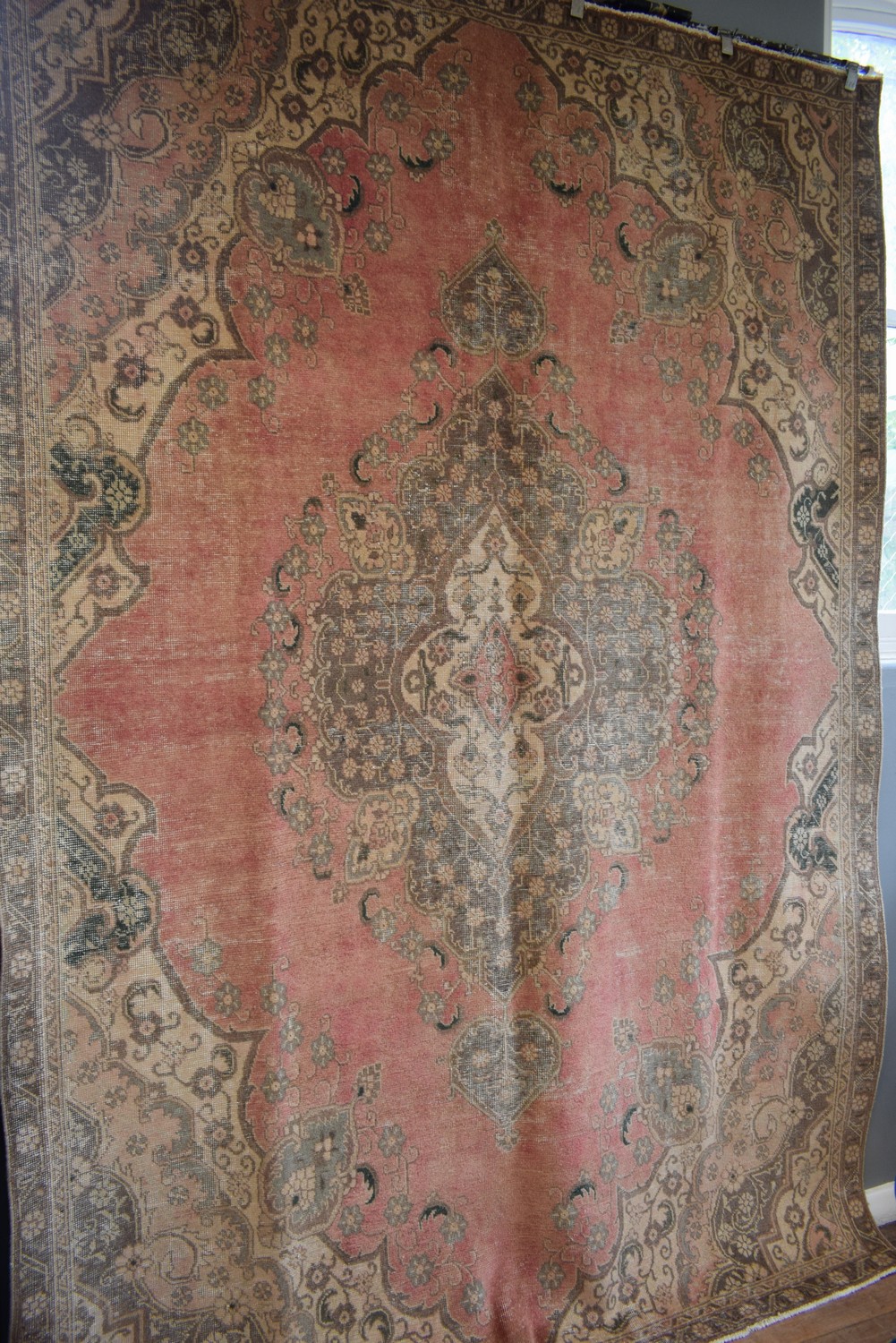 A UNIQUE MODERN OVER-DYED VINTAGE PERSIAN TABRIZ CARPET. EX-GALLERY EXHIBITED. CREATED FROM A FINELY HAND-KNOTTED VINTAGE MEDALLION DESIGN PERSIAN TABRIZ CARPET, KNOTTED USING HAND SPUN WOOL ON STRONG COTTON WARPS WITH THE PILE SHORN DOWN. THE RUG IS OVER-DYED IN GREEN, BEIGE & ROSE DYES. AS SEEN IN VOGUE & HOME DÉCOR MAGAZINES. CERTIFICATE OF AUTHENTICITY INCLUDED. SIZE: 328X224CM ORIGIN: PERSIA - RRP: $6,900