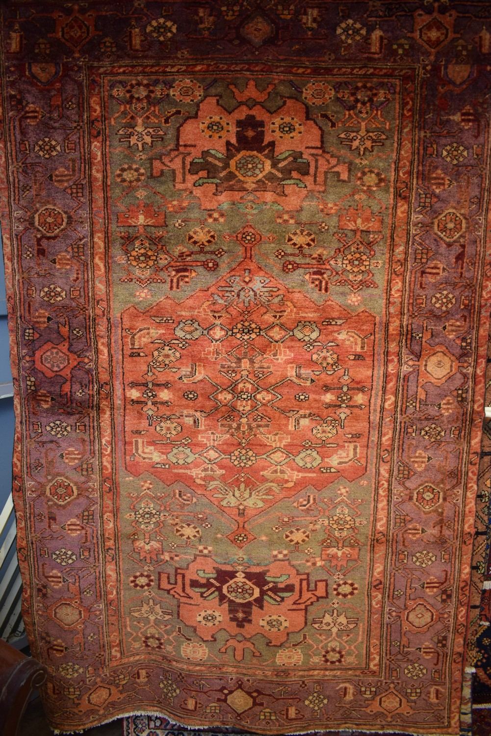 A TRIBAL PERSIAN KHAMSEH RUG. 100% HANDSPAN WOOL, NATURAL DYES. VILLAGE WEAVE FROM THE HAMADAN REGION WITH TRIBAL DESIGN OF GEOMETRIC PATTERNS AND A CENTRAL MEDALLION CONTAINING FLORAL PATTERNS SET IN TONES OF SOFT RED, GREEN AND PURPLE. CERTIFICATE OF AUTHENTICITY INCLUDED. SIZE: 233X150CM ORIGIN: PERSIA - RRP: $1,900