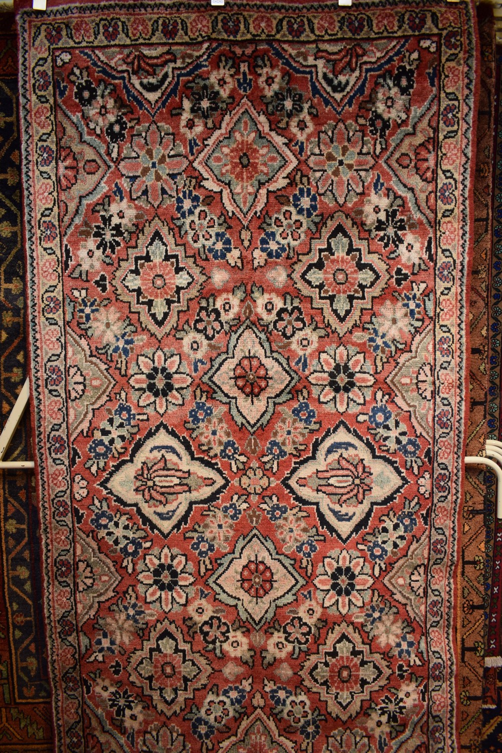 A CIRCA 1970'S PERSIAN MAHAL CARPET. 100% WOOL. SOLID & DENSE PILE. HAND-KNOTTED VILLAGE WEAVE & VINTAGE PILE FROM THE ARAK REGION WITH TRADITIONAL DESIGN OF ALL-OVER FLORAL HERATI MAHI PATTERNS SET WITHIN A RED FIELD. BORDER OF HERATI PATTERNS & ROSETTES. STURDY & HARD-WEARING. CERTIFICATE OF AUTHENTICITY INCLUDED. SIZE: 252X117CM ORIGIN: PERSIA - RRP: $1,800