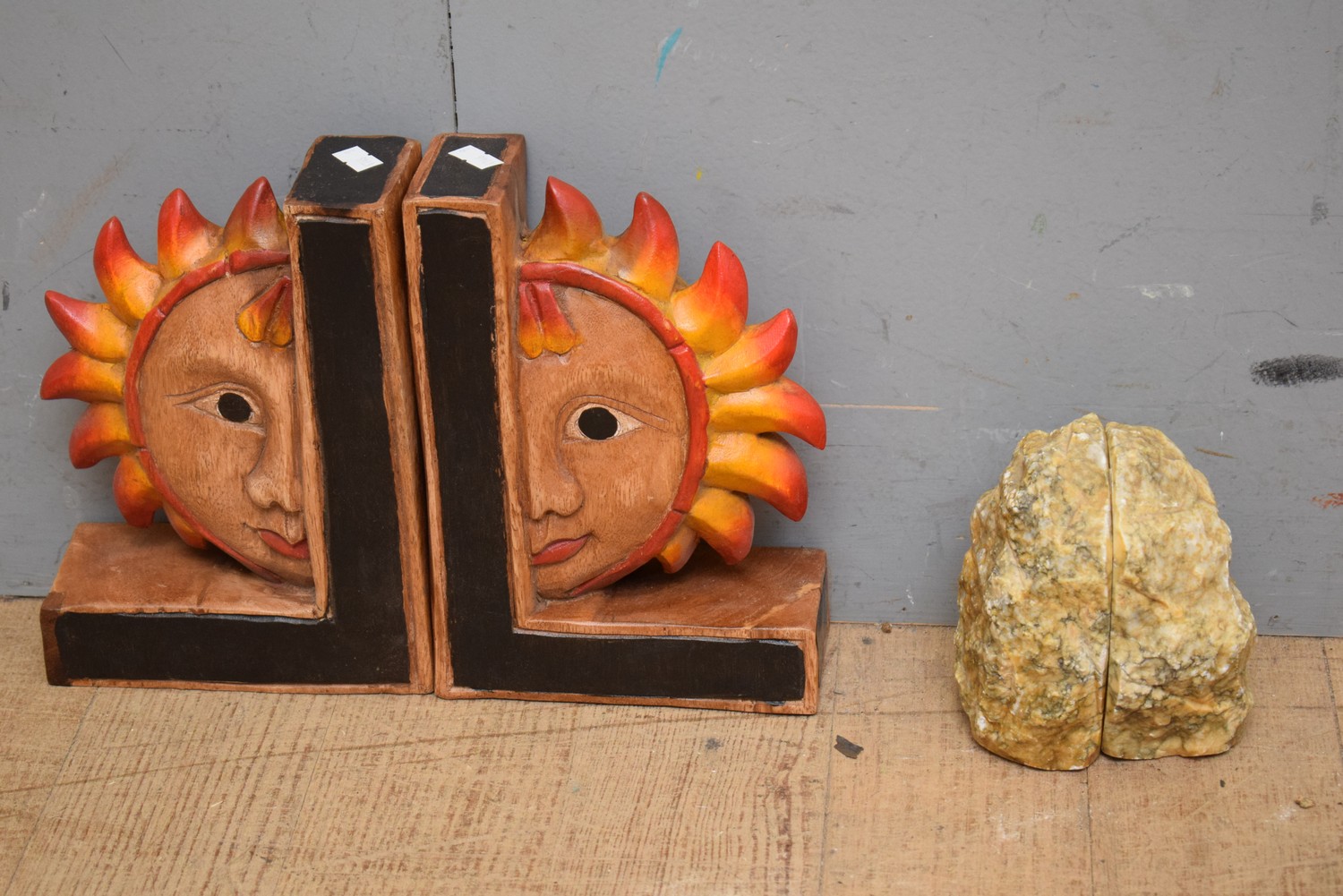 A PAIR OF SUN BOOKENDS AND A PAIR OF ALABASTER BOOKENDS (24 CM H) (LEONARD JOEL DELIVERY SIZE: SMALL)