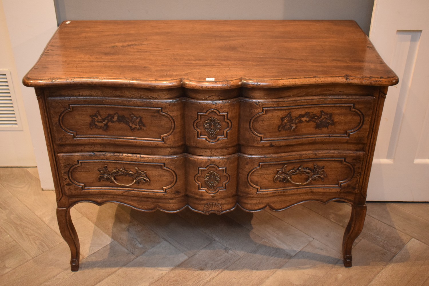 A LOUIS XV STYLE TWO DRAWER SERPENTINE TOP COMMODE (84H x 119W x 58D CM) (PLEASE NOTE THIS HEAVY ITEM MUST BE REMOVED BY CARRIERS AT THE CUSTOMER'S EXPENSE. LEONARD JOEL STAFF CANNOT ASSIST CARRYING THIS ITEM) (X-LARGE ITEM)