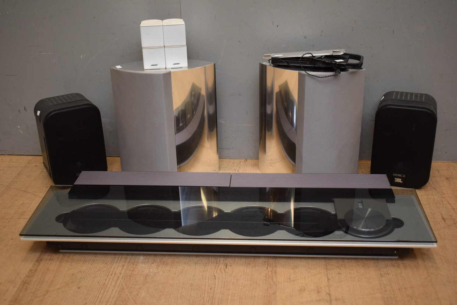A BANG & OLUFSEN BEOSOUND 9000 SIX CD SYSTEM (NO REMOTE) WITH TWO BEOLAB 4000 SPEAKERS, TOGETHER WITH A PAIR OF JBL CONTROL IC SPEAKERS AND PAIR OF WHITE BOSE MINI SPEAKERS (ALL UNTESTED) (LEONARD JOEL DELIVERY SIZE: LARGE)