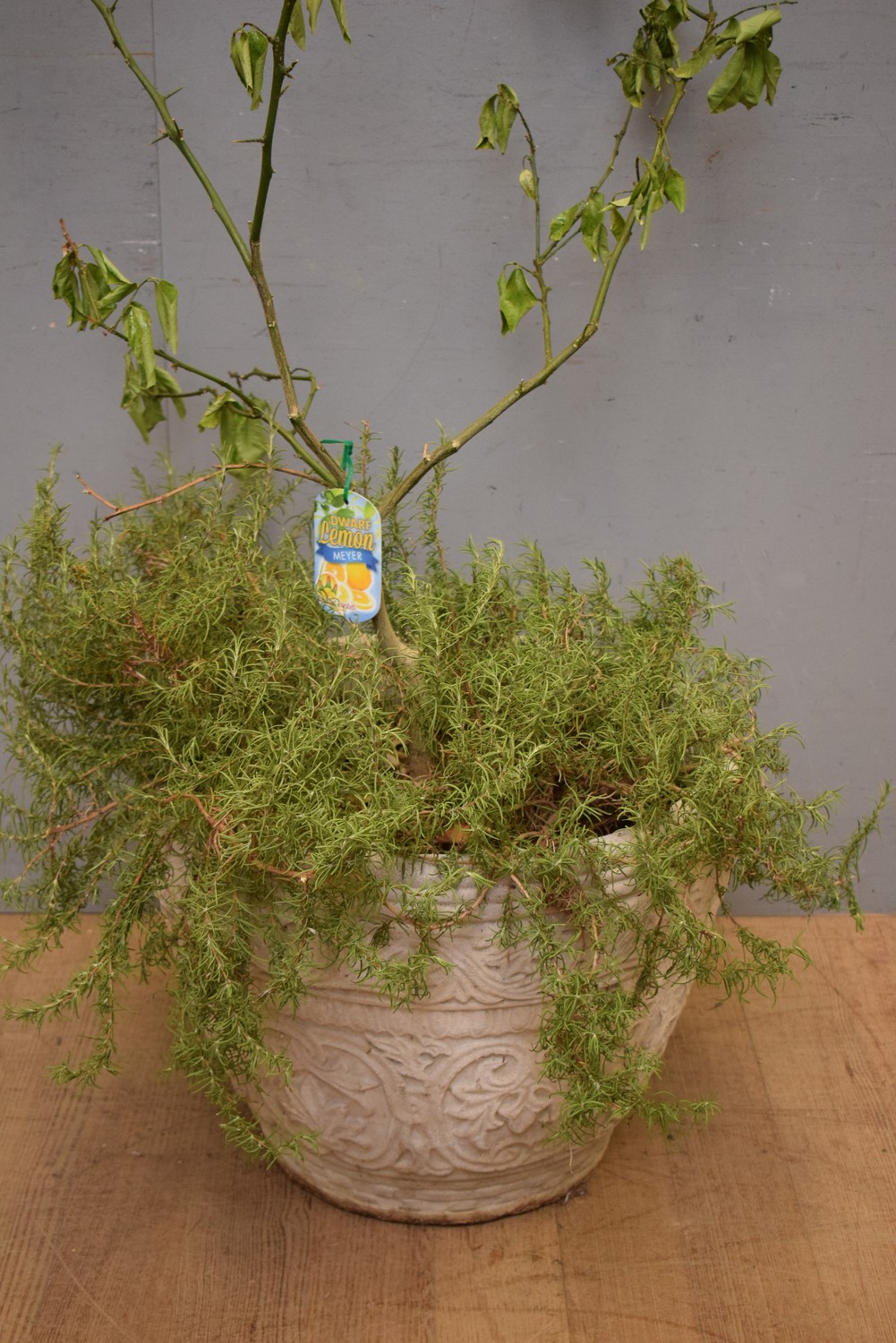 A CLASSICAL STYLE CONCRETE POT WITH ROSEMARY & LEMON TREE (40H x 53D CM) (PLEASE NOTE THIS HEAVY ITEM MUST BE REMOVED BY CARRIERS AT THE CUSTOMER'S EXPENSE. LEONARD JOEL STAFF CANNOT ASSIST CARRYING THIS ITEM) (X-LARGE ITEM)