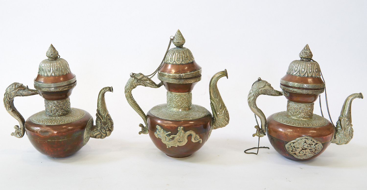 THREE COPPER AND BRASS TIBETAN TEAPOTS, LEONARD JOEL LOCAL DELIVERY SIZE: SMALL