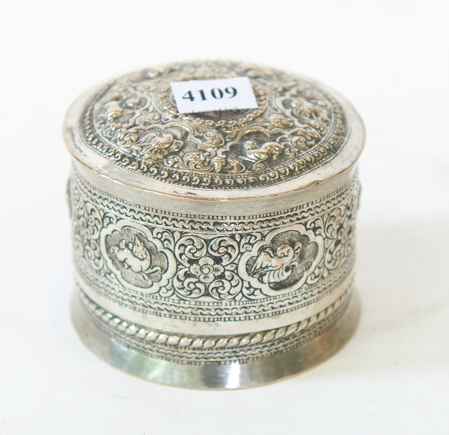AN EASTERN SILVER LIDDED BOX WITH EMBOSSED DECORATION H.7.5CM, LEONARD JOEL LOCAL DELIVERY SIZE: SMALL