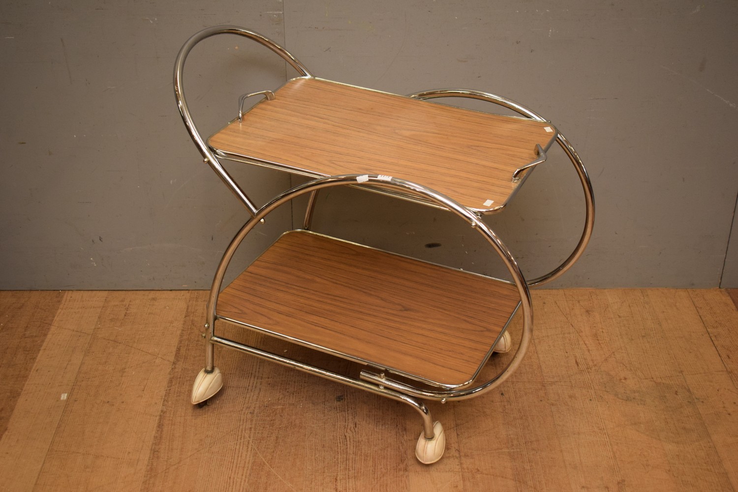 AN ART DECO CHROME AUTO TROLLEY WITH LIFT OFF TRAY (A/F TO ONE CASTER CAP) (77H x 85W x 45D CM) (LEONARD JOEL DELIVERY SIZE: MEDIUM)