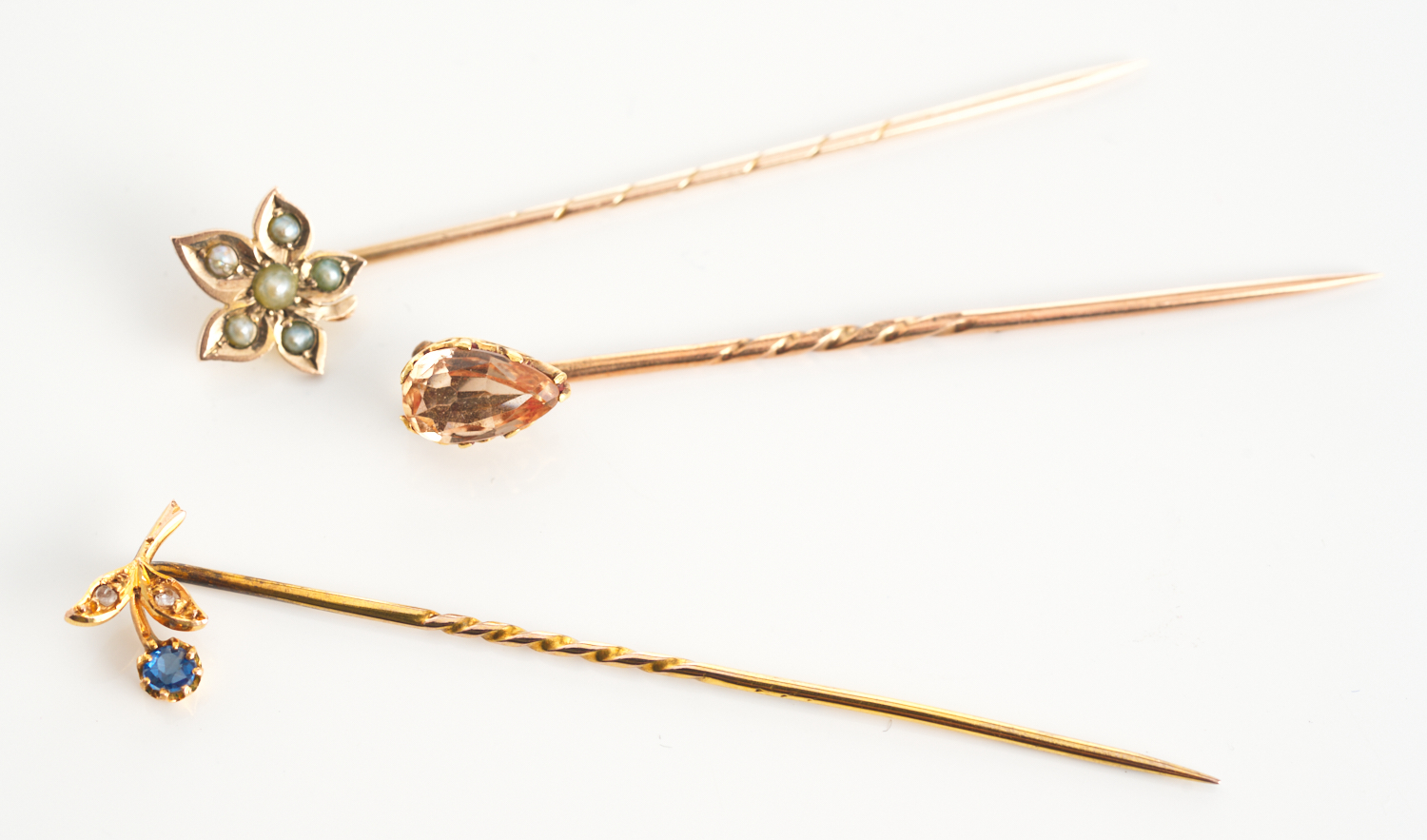 A COLLECTION OF THREE STICKPINS IN 9CT GOLD, INCLUDING SEED PEARL, A CITRINE AND A SAPPHIRE SET, 3.5GMS